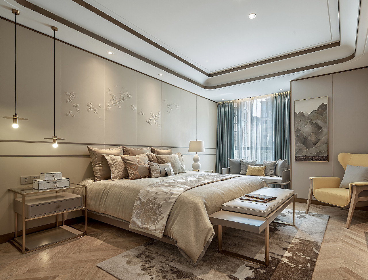 皮革床頭背景,搭配古銅線條,簡單的山水裝飾,淺咖色營造空間氛圍,一派中式意趣。