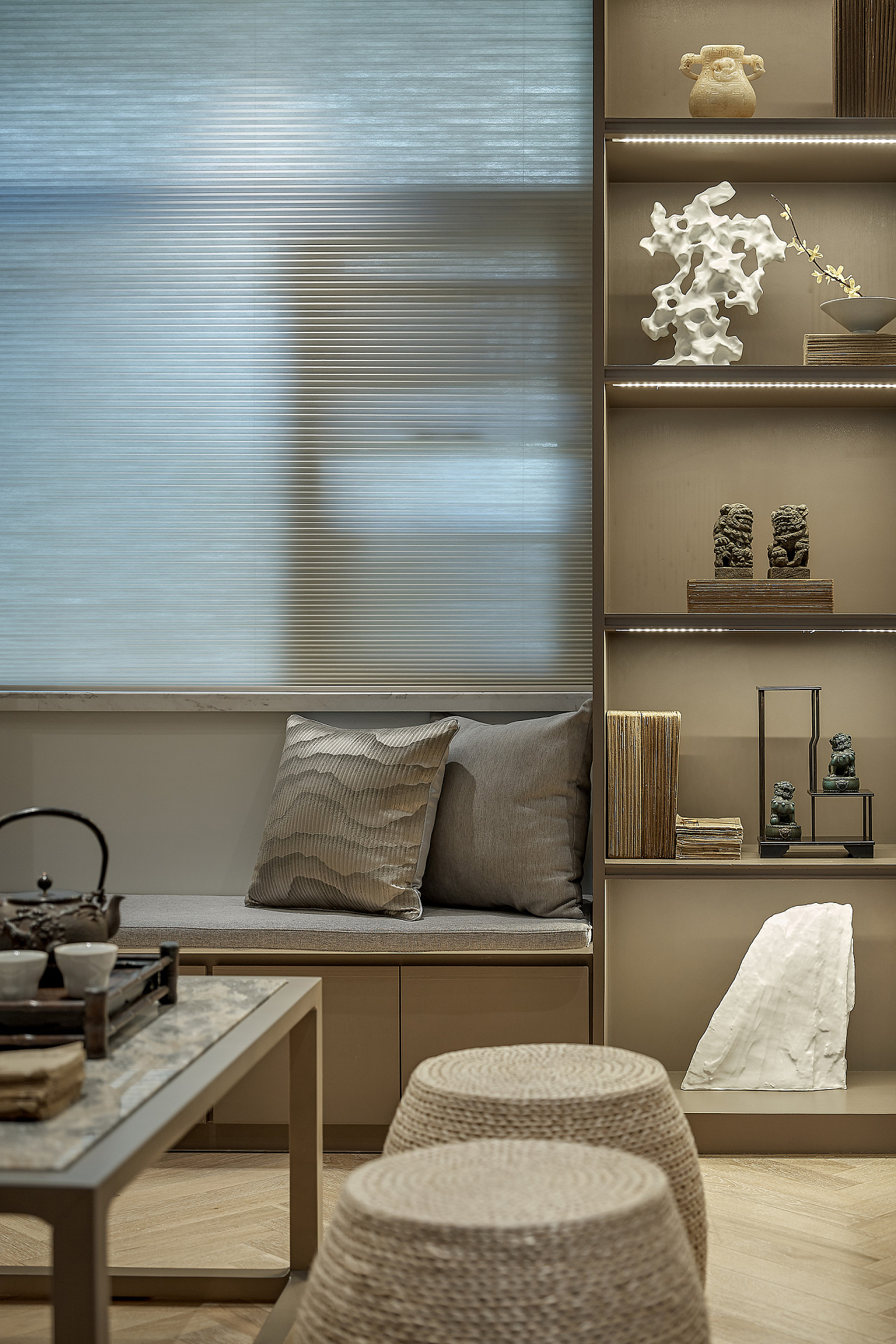 紛繁復雜的現代生活,當我們習慣了步履匆匆的快節奏,然而生命的流逝真當如此?設計師用刪繁就簡,回歸本真的手法,營造溫暖含蓄的中式居家空間,讓時間的腳步慢下來,生活不只是忙碌。