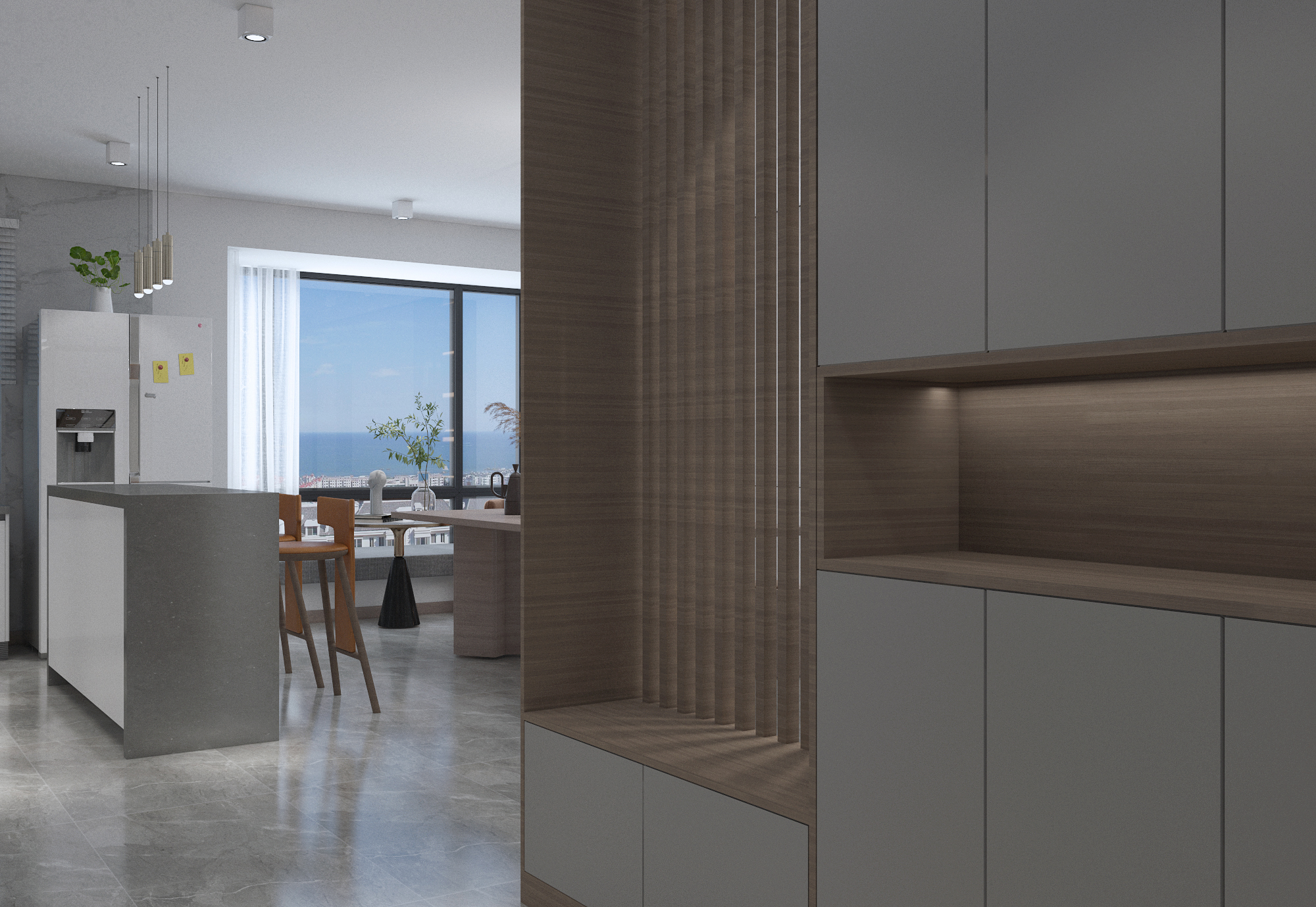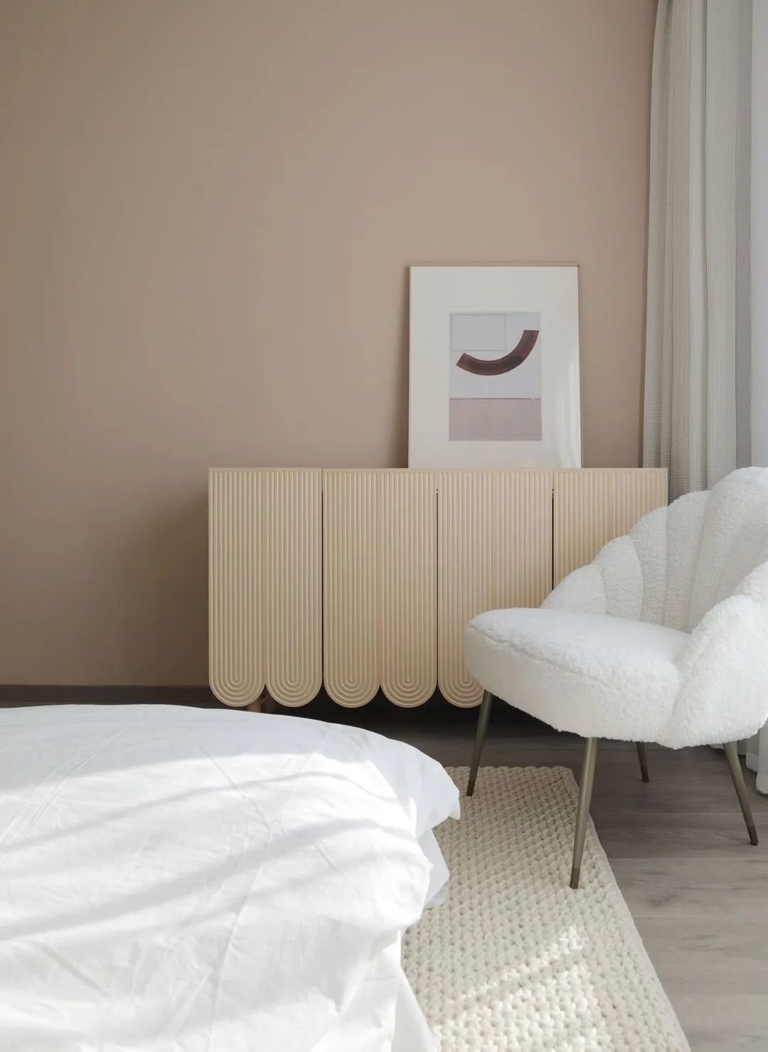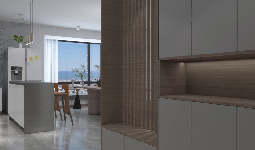年輕夫妻居住,比較追求設計感和舒適度。摒棄了常規沙發客廳的效果,放了大桌子的效果,男女主人可以在長桌上辦公,也可以陪孩子一起做手工,增添了親子間的樂趣。
