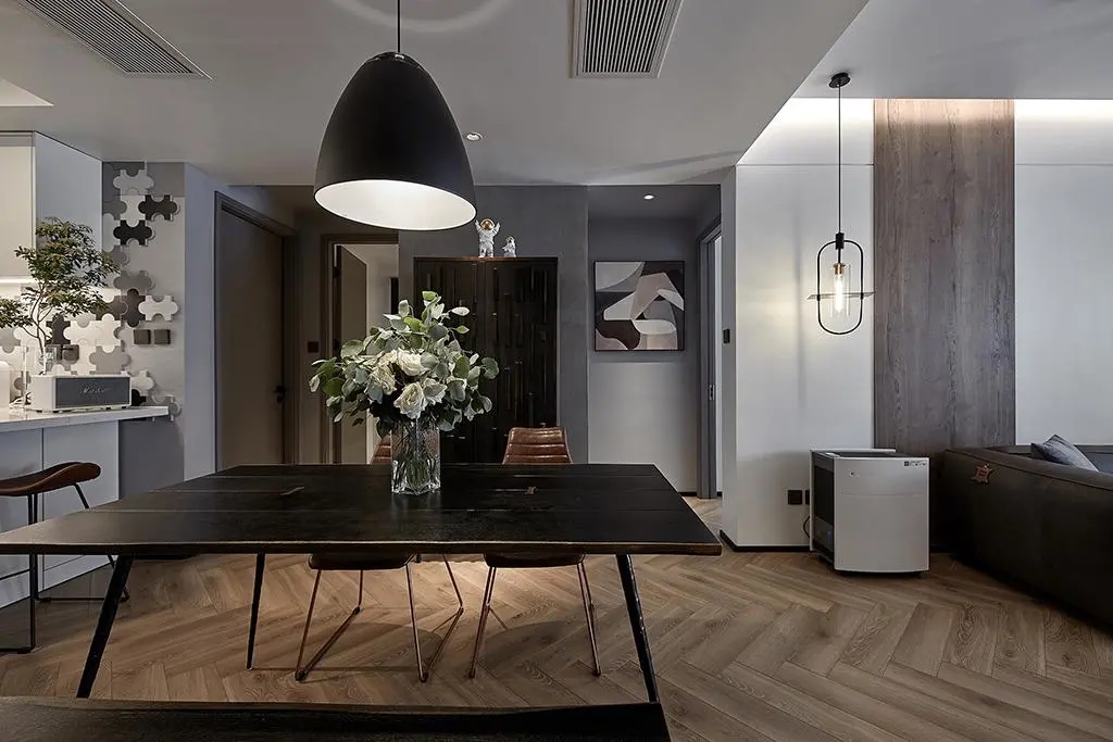 客廳整體采用極簡復古風格,人字拼的復合地板給家具和裝飾品提供了一個有層次感的背景。水泥灰墻面、巖灰色沙發、水泥色茶幾點綴上一圈金色,硬朗與柔美共存,沉淀出厚重的氣息。在喧囂都市里,讓家里的顏色沉靜下來,也給內心騰出一片清靜凈土,休整后迎接新一天的整裝待發。