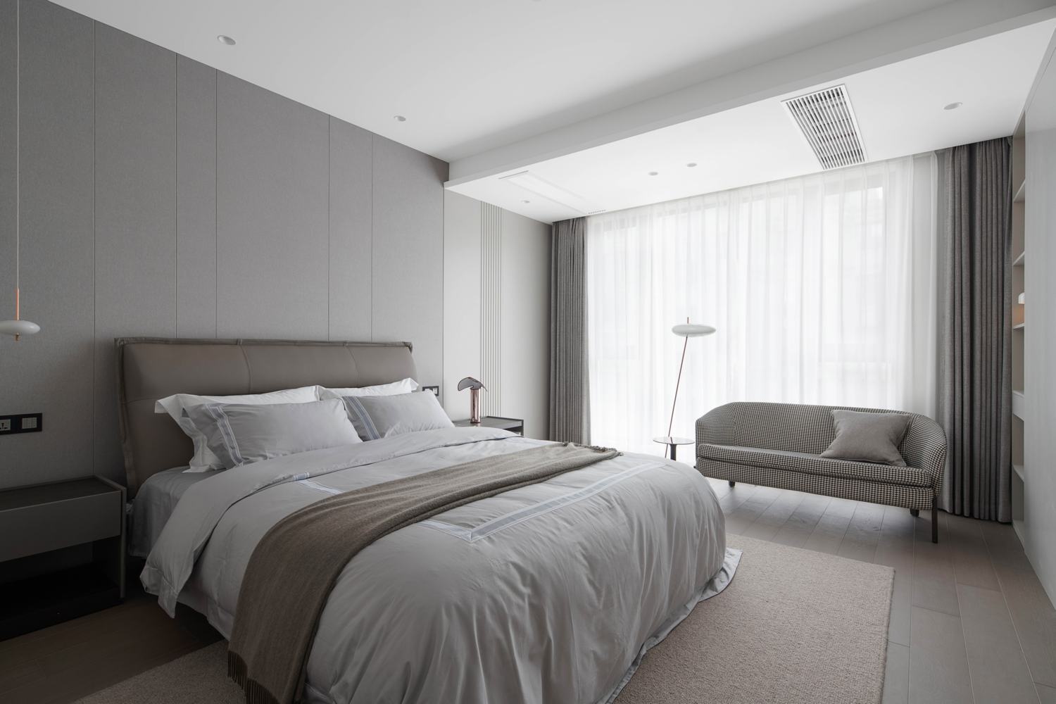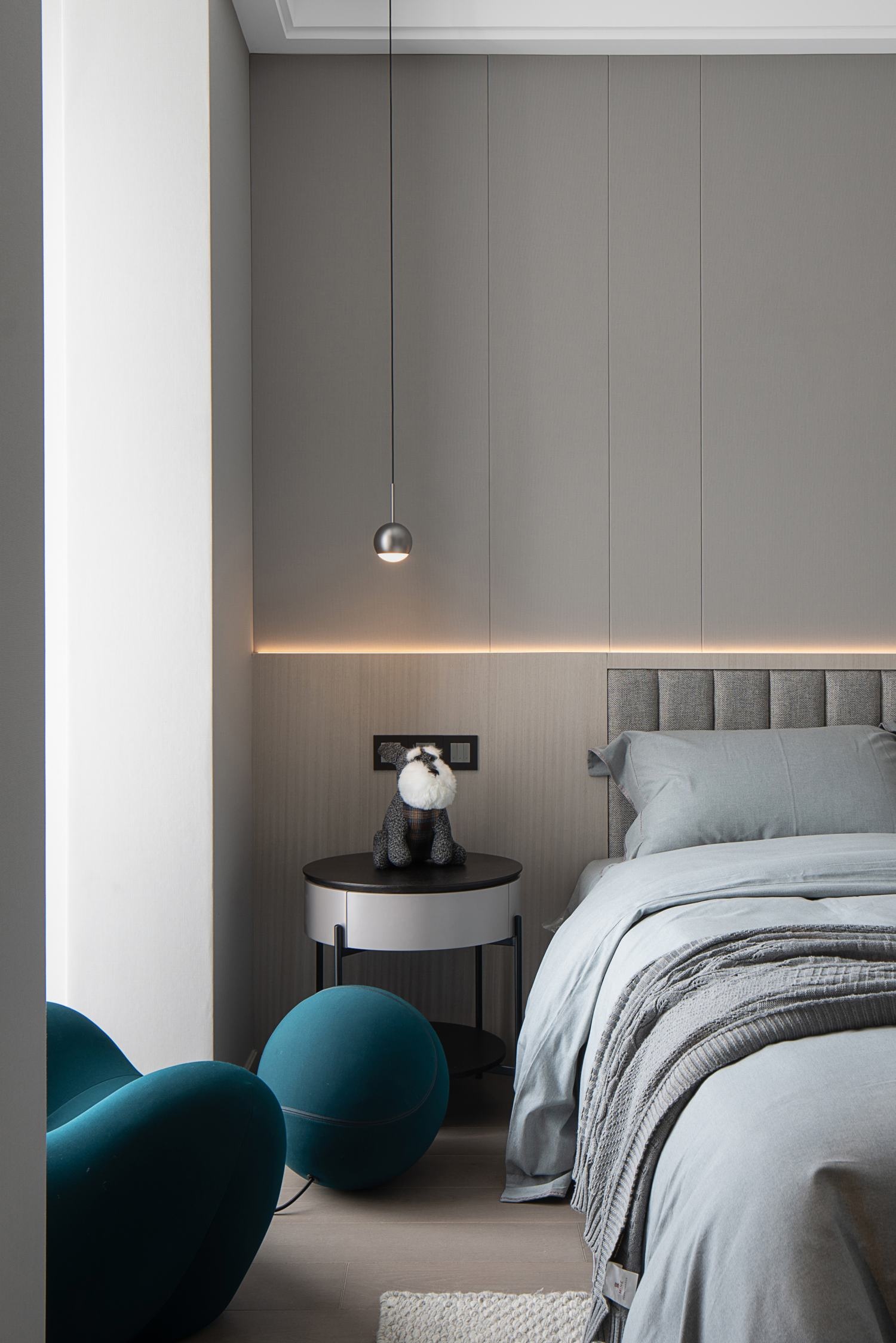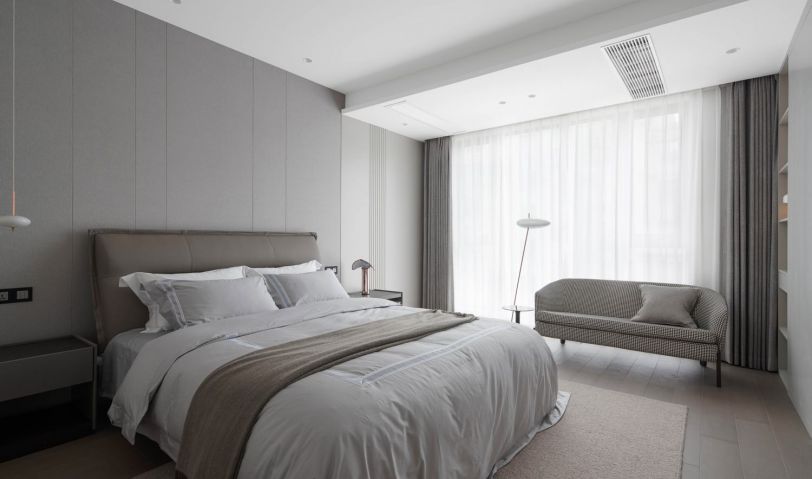 大面積的暖灰色奠定了簡約的視覺基調,豎紋墻飾、柔軟布藝默契的形成一種舒適的氛圍。寬大的落地窗為主臥提供了充足的采光和開闊的視野,坐在軟臥沙發里讀一本最愛的書,享受生活中那些不經意的幸福時光。