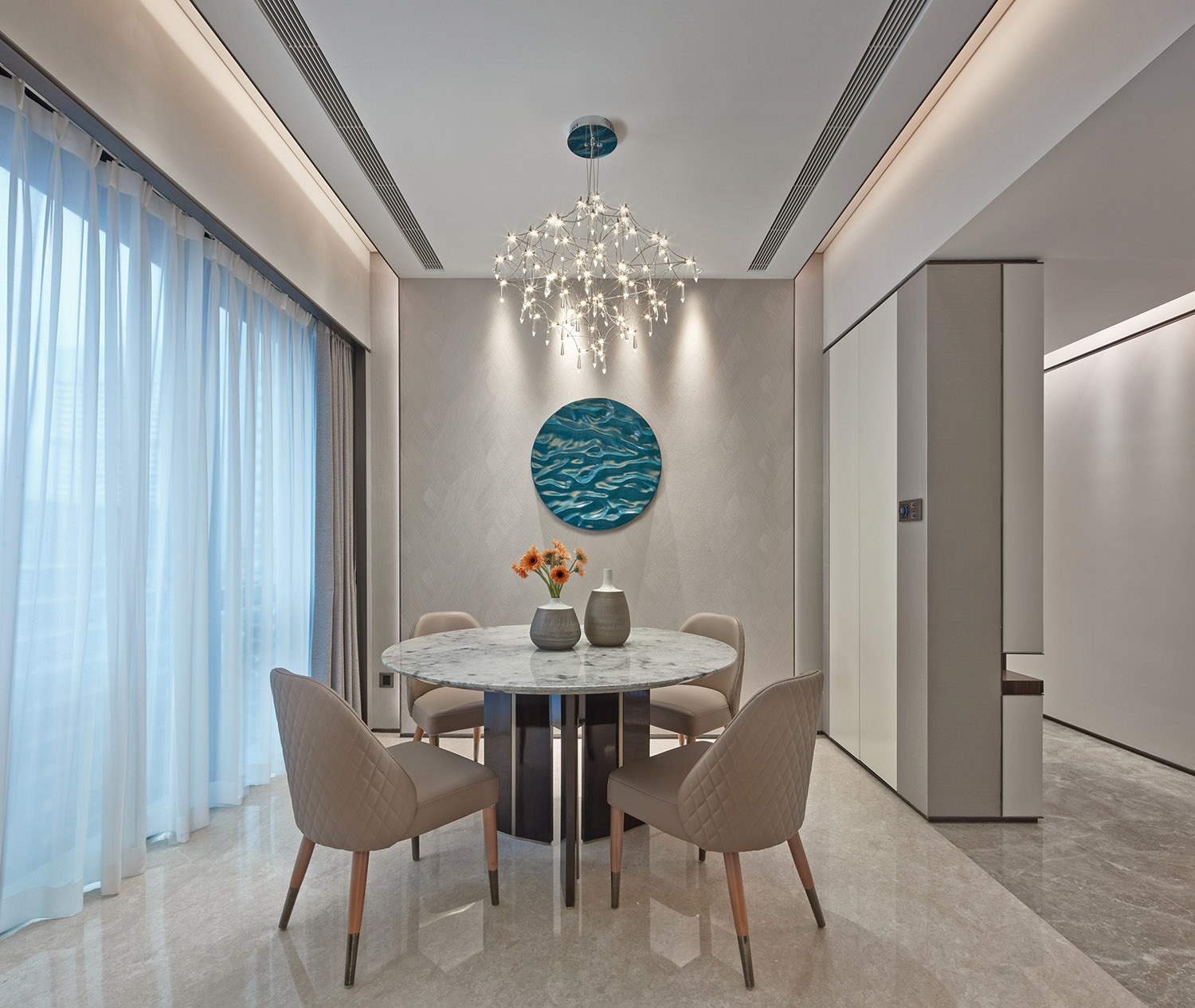 這世間,唯有美食與愛不可辜負。客餐廳天花采用多層次的燈光,主燈采用BAXTER 的吊燈,搭配輕奢質感的墻布,這樣就是一個舒適愉悅的就餐空間了。人與人之間只要有一個焦點,就能讓我們匯集在一起,去探討美好的人生。質感的島臺和藍色的靠背,就好像海面的小島一樣,在這里喝酒暢聊,有一種自由暢然之感。
