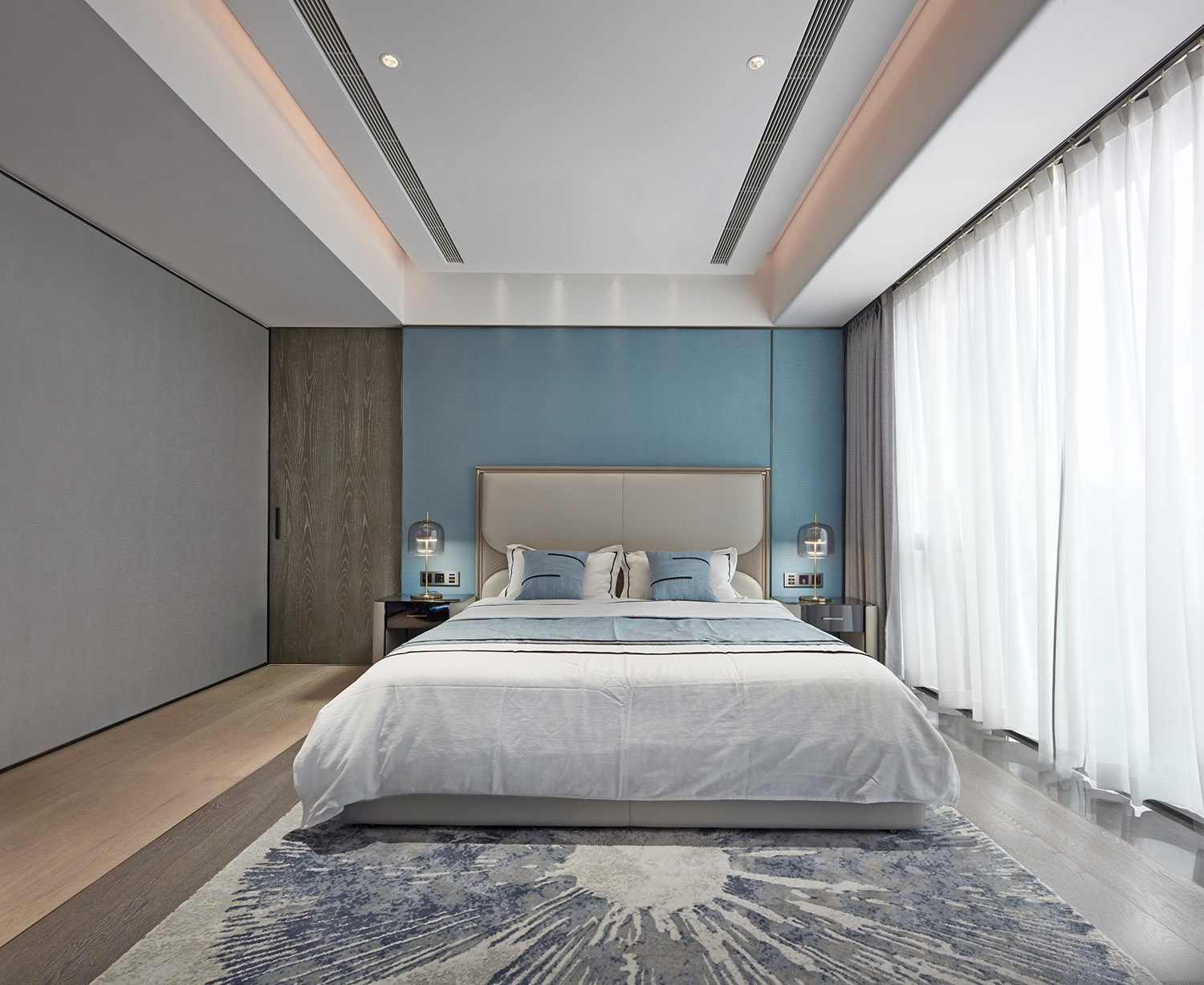 客廳的天花板至背景墻,整體一氣呵成,沒有邊界感,讓生活更加的自在。圓弧的造型搭配側邊的墻布,輕柔觸感,讓空間增加軟的感覺。光線搭配十分柔和,背出光的燈帶,有延伸的層次感,在感官上非常的舒適;自然光透過薄紗窗簾,空間透亮而清澈,仿若置身于被陽光直射的水中。