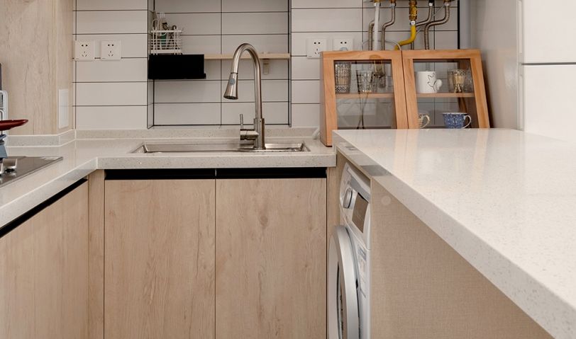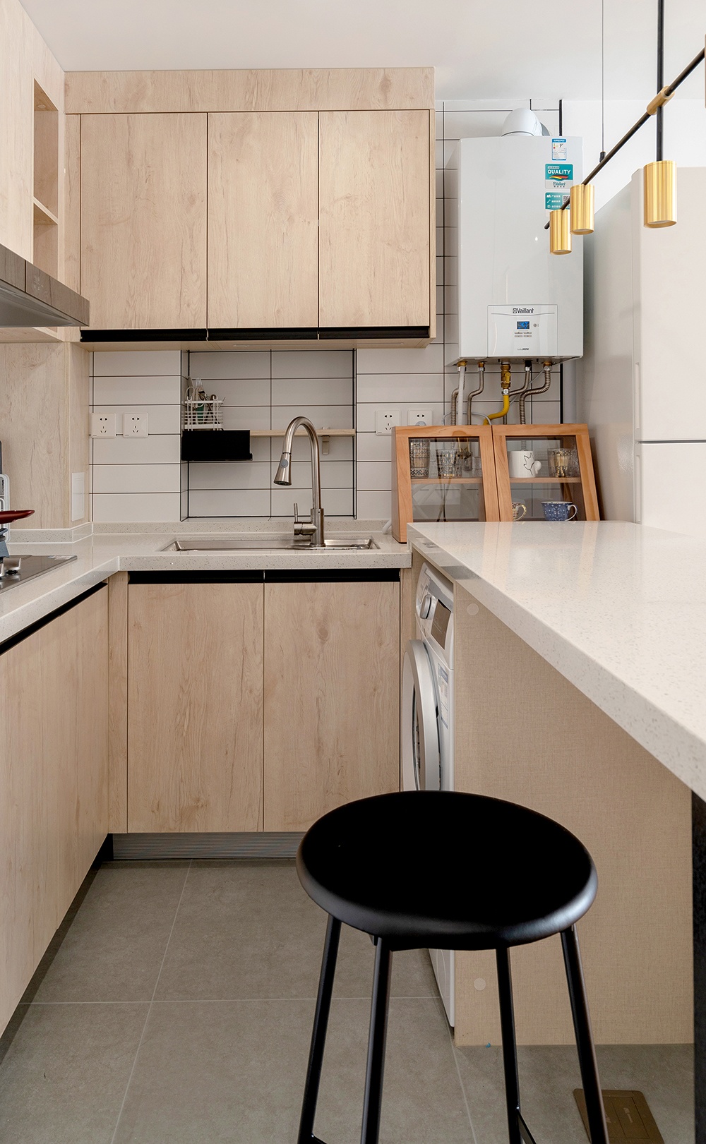 廚房區(qū)域把原本通往小陽臺的門洞封堵后,實(shí)現(xiàn)U型廚房布局,并利用了小陽臺門洞的深度,在水槽上方做了凹龕,擺放平時要使用的洗潔精抹布的等物品。在壁掛爐下方,安放了杯架,可以適當(dāng)?shù)恼趽醣趻斓墓艿馈N房墻面用的是小白磚整體顯的干凈自然,地面的純灰色地磚,襯托柜體用色。底柜體與吊柜材質(zhì)統(tǒng)一,使得廚房空間更加的完整。