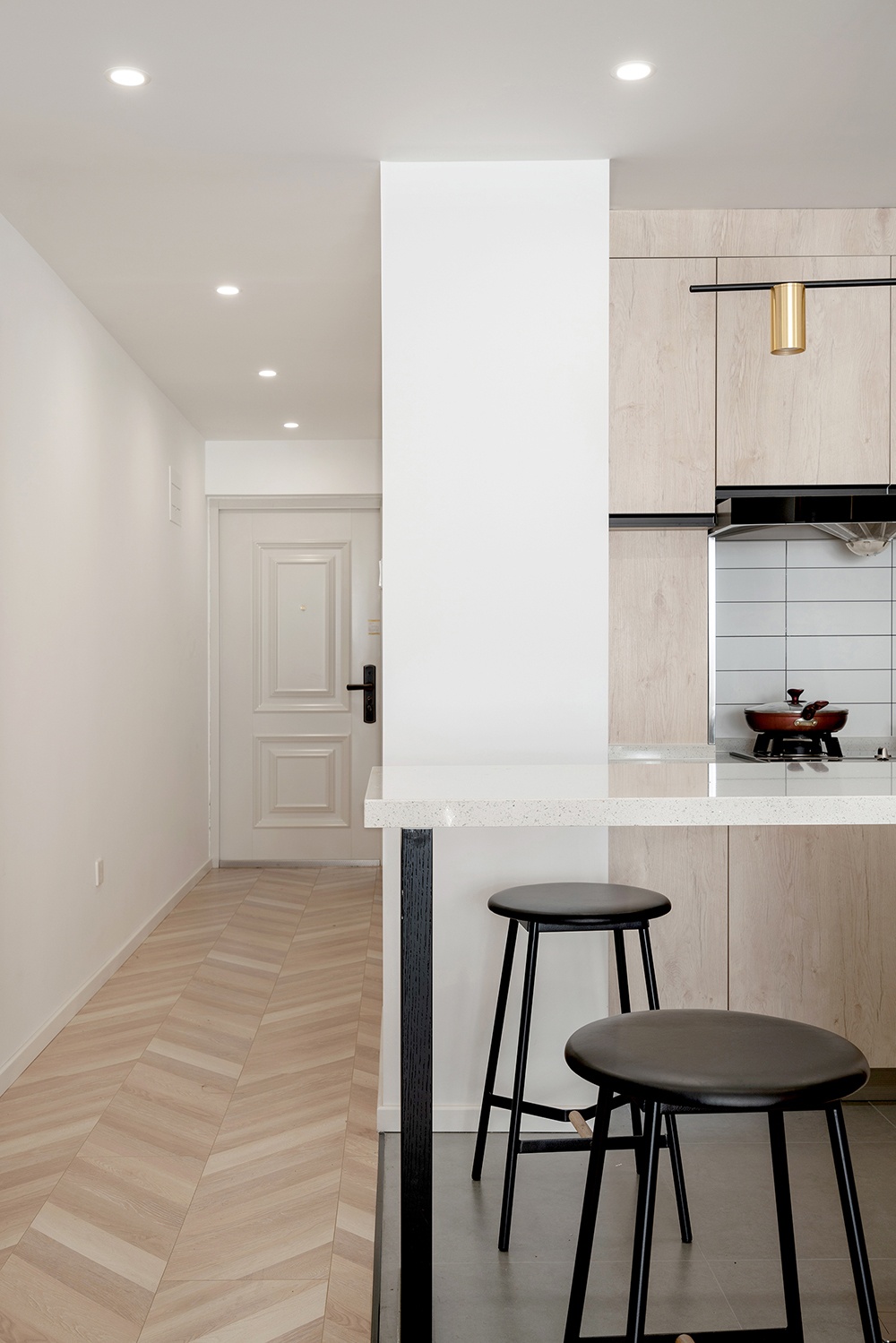 玄關(guān)經(jīng)過格局改造后,大大增加了鞋柜的儲存量,讓一組柜子,就可以滿足全家人的鞋子儲藏。鞋柜的最下方做懸空,方便屋主進(jìn)門后,更換居家拖鞋,中下部分做當(dāng)季鞋子的儲存,中部做了木色套格做為包以及鑰匙的擺放區(qū),上部區(qū)域做換季鞋子的儲藏區(qū)域。