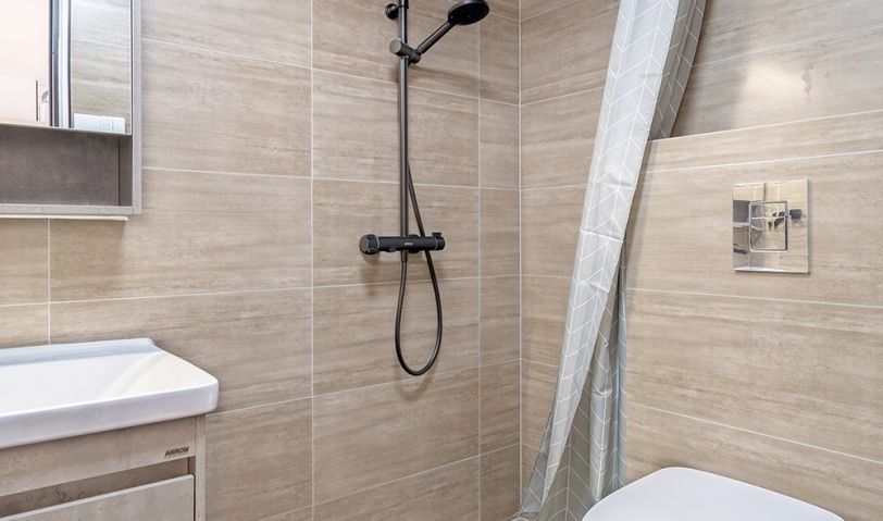 淋浴空間采用浴簾做遮擋的形式,讓使用方便,空間更加的靈活。壁掛馬桶懸空,方便地面的清潔工作。黑色的浴具,使衛(wèi)生間凸顯現(xiàn)代感。