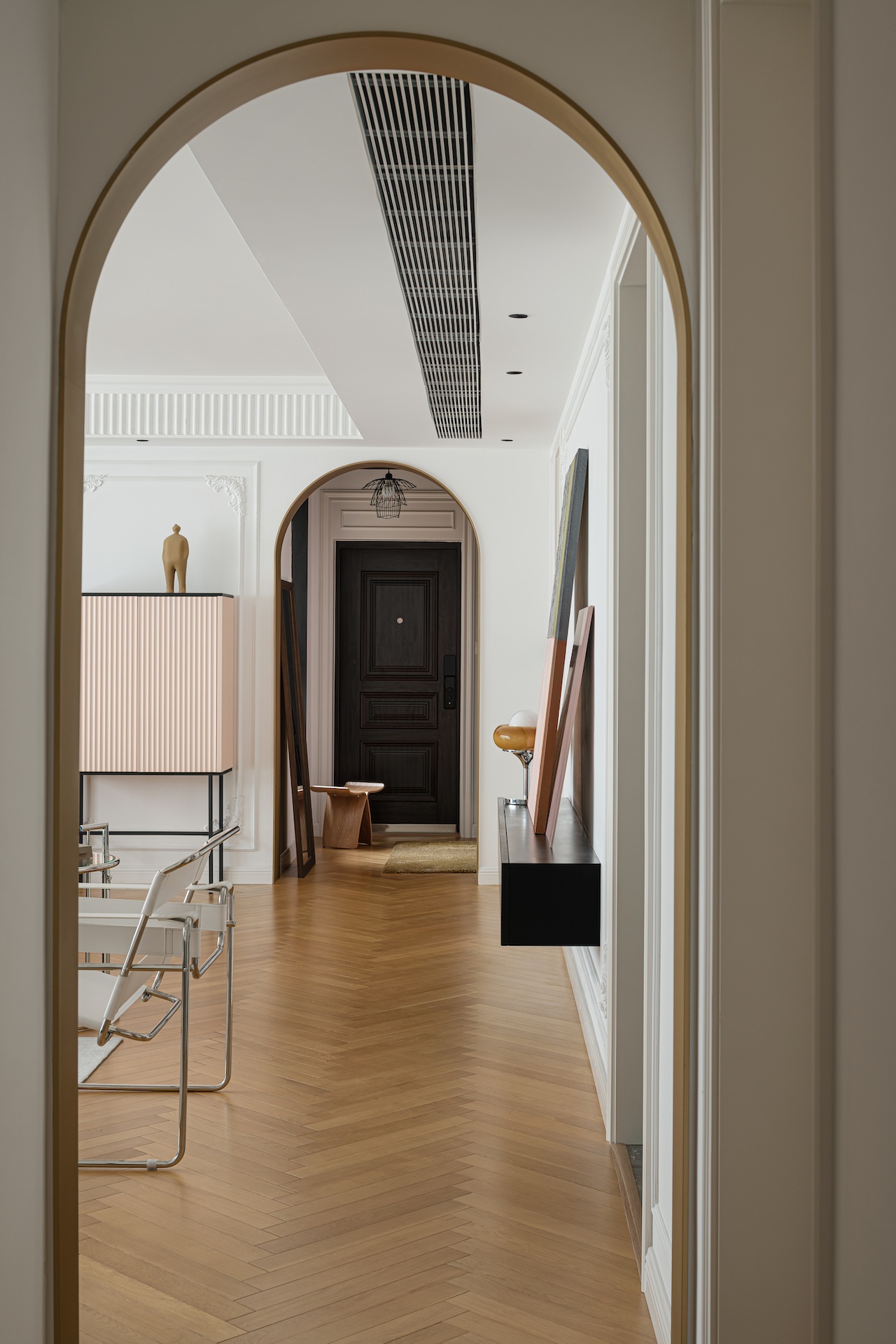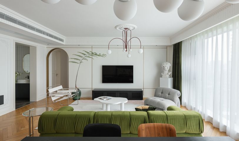 穿過(guò)玄關(guān)的弧形門(mén)洞就是客餐廳空間,整個(gè)空間采用白色為空間主基調(diào),加上溫潤(rùn)的橡木色人字鋪木地板加以點(diǎn)綴,再搭配上豐富色彩的軟裝飾品,使整個(gè)空間變得豐富起來(lái),大而不空,滿而不亂。連接客廳與過(guò)道的門(mén)洞也由方形改為了拱形,與玄關(guān)的門(mén)洞相呼應(yīng)。