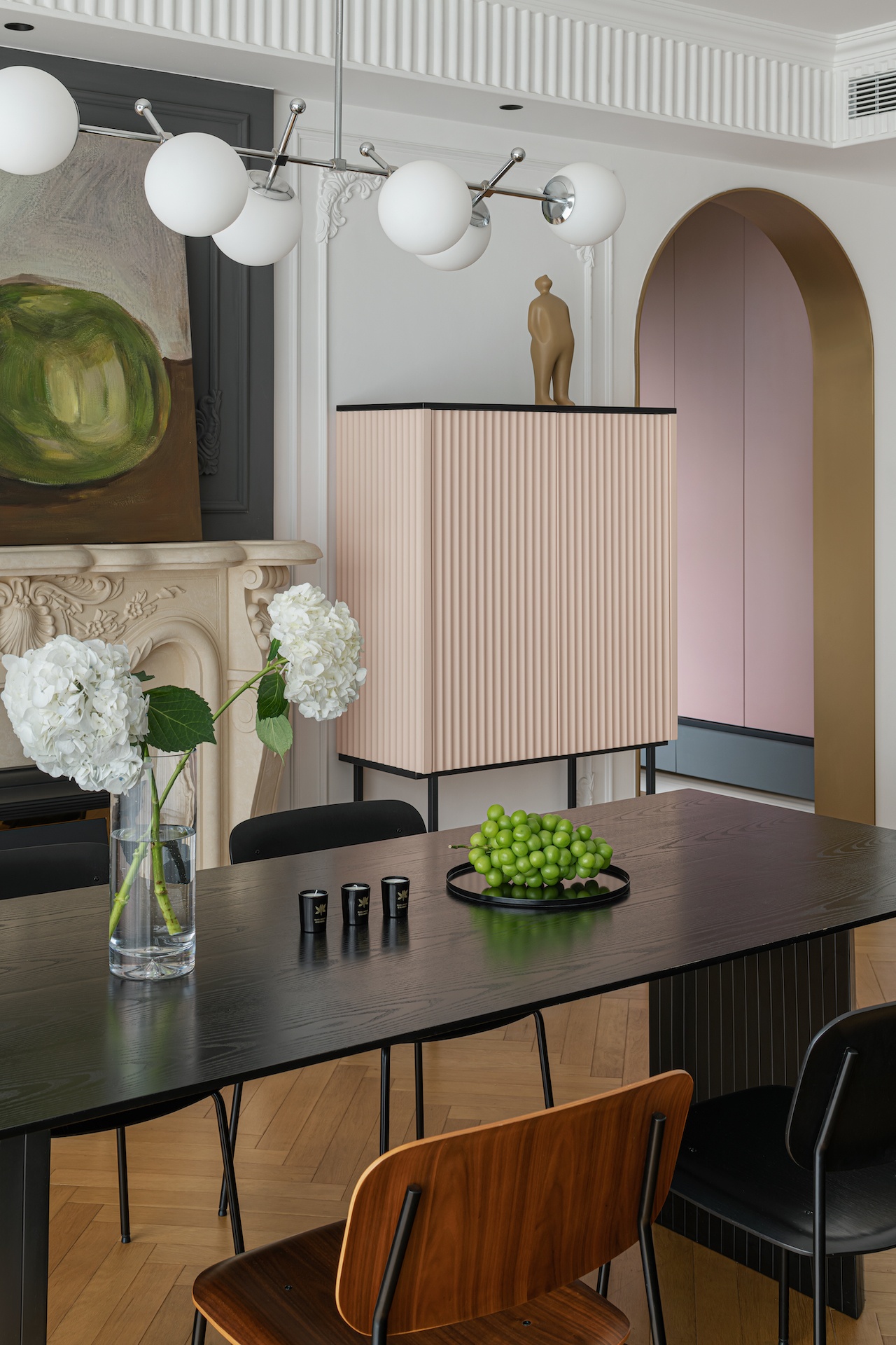 淺粉色與灰色碰撞出高級(jí)的火花,穩(wěn)重大方的灰色讓粉色更加的甜美優(yōu)雅,柔和的淺粉色也很好的中和了灰色的低調(diào)沉悶,搭配上墻面石膏雕花線條,地板采用魚(yú)骨拼,增加了復(fù)古的質(zhì)感,整個(gè)空間顯得高貴而又不失溫柔。