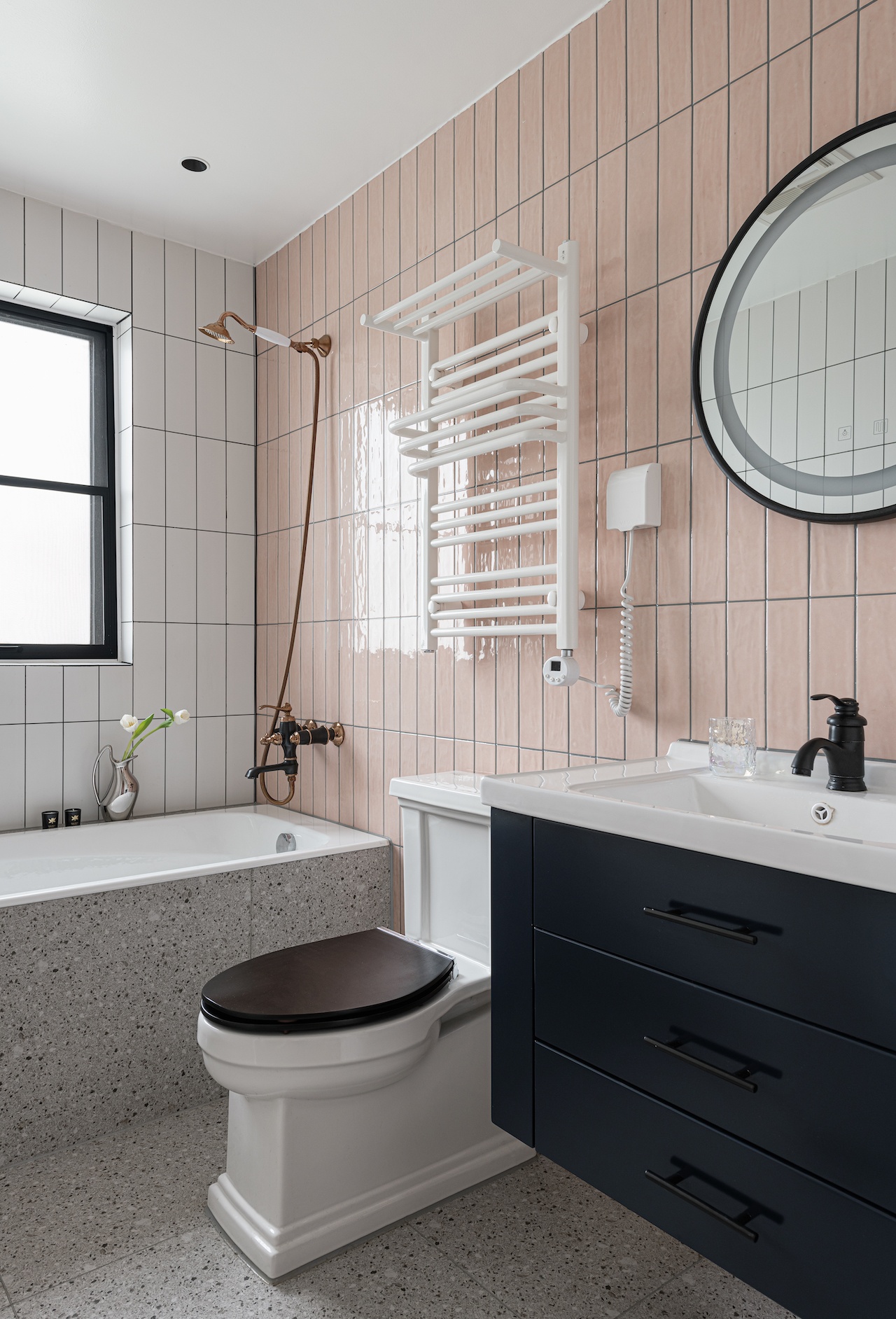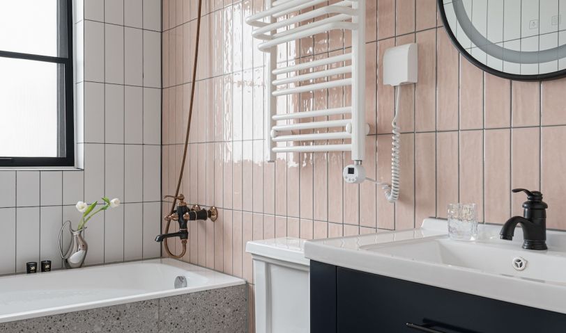 粉與白色的墻磚像蜜桃一樣,使空間透著甜蜜,搭配仿水磨石瓷磚,加上深藍(lán)色的浴室柜,不同的色彩碰撞出清新優(yōu)雅的味道。
