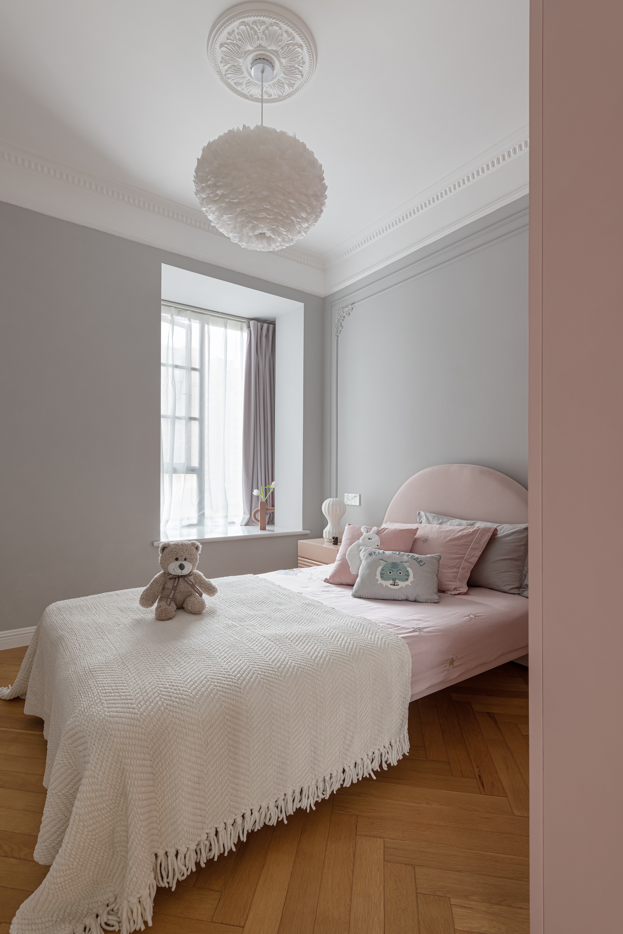 整個(gè)空間的設(shè)計(jì)上比較活潑可愛(ài),高級(jí)灰與少女粉的碰撞,加上夢(mèng)幻的羽毛燈,氣質(zhì)優(yōu)雅得像童話里的小公主。