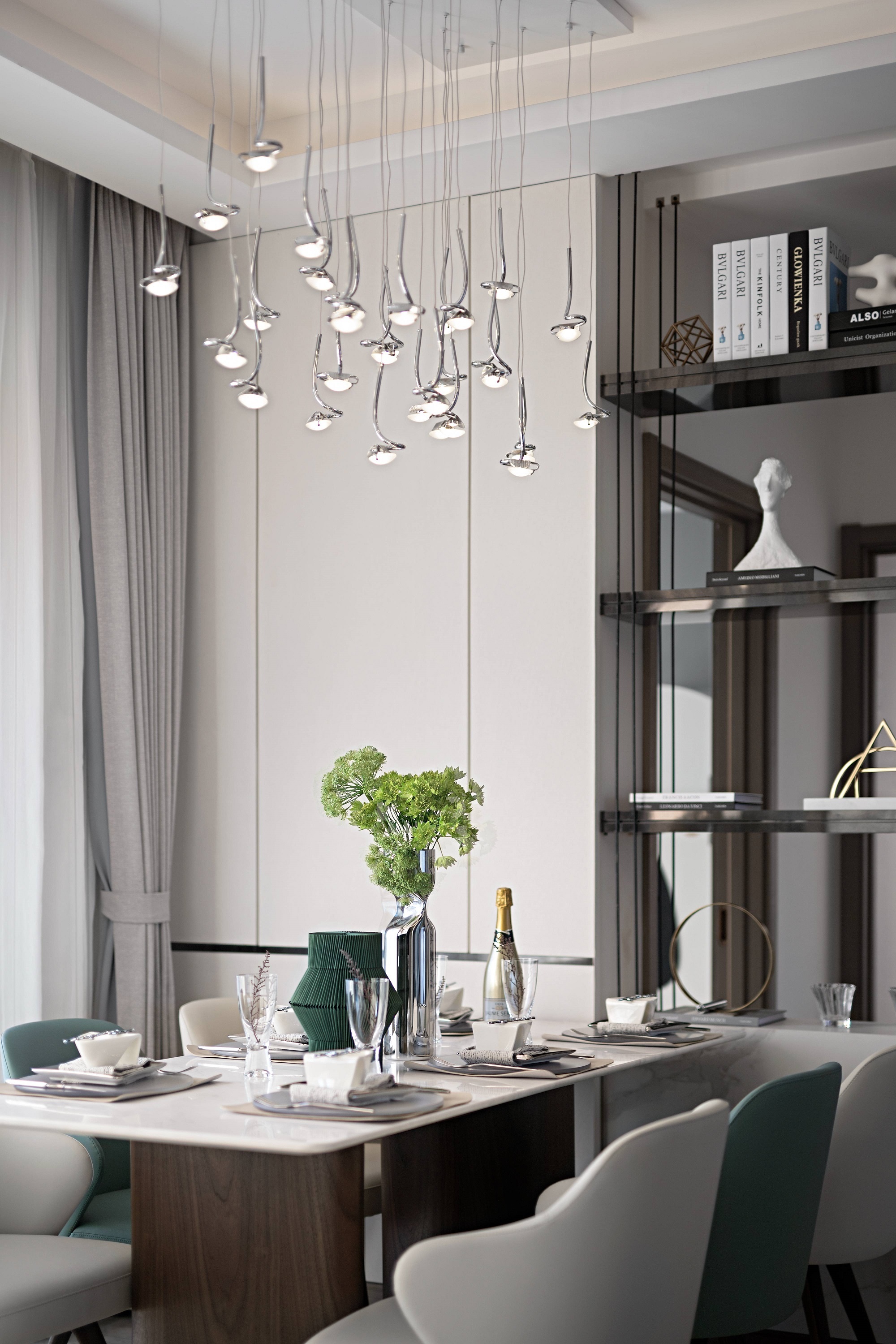 和諧而安靜的環(huán)境給人無限的恬靜,休閑椅的一抹復古綠投射出藝術(shù)的張力,旁邊的藝術(shù)擺件在表象視覺之下,設(shè)計師極盡克制,賦予了客廳時尚美學和生活藝術(shù)。