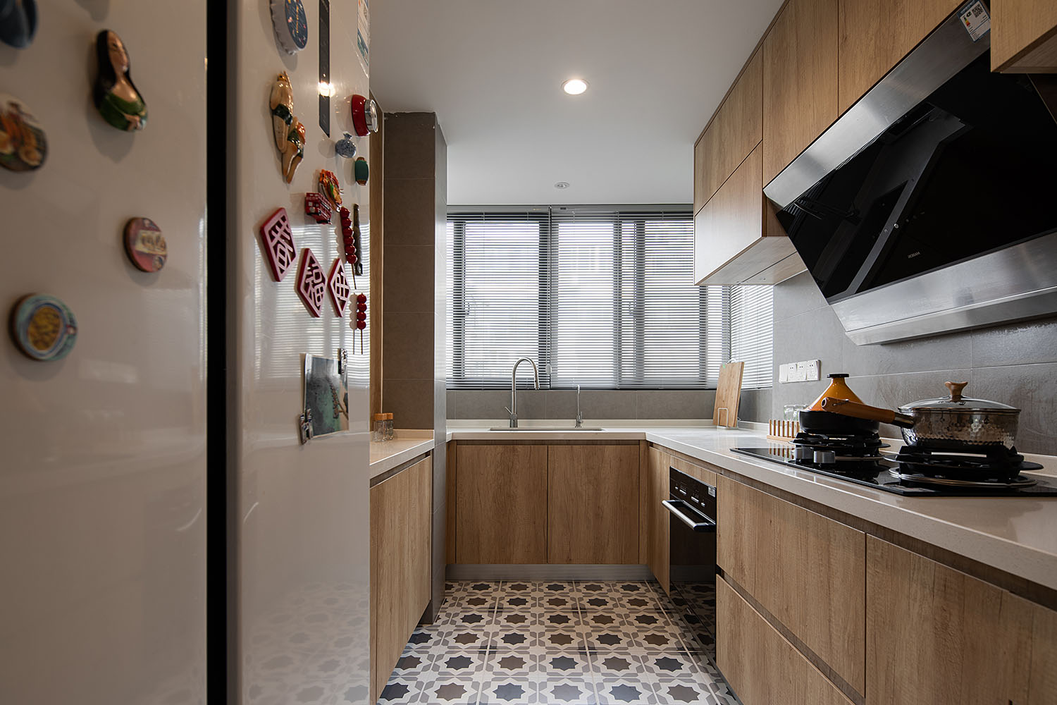 復古花磚與暖棕色的木質色彩搭配,給人嫻靜、舒適的感受
