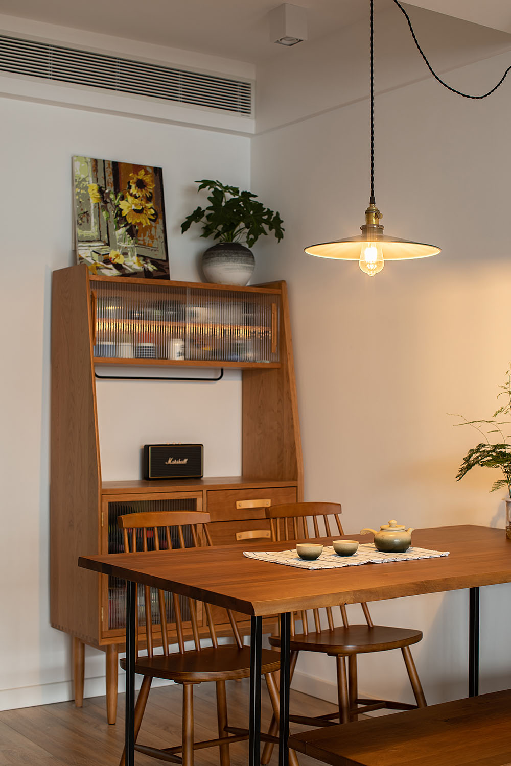 圍繞著寧靜舒適作為整個設計的中心思想,主臥采用了具有寧靜力量的孔雀藍為主色調搭配木材質,讓屋主休憩時,能體會到身體自在舒適以及彌漫在周圍的無聲的溫暖。