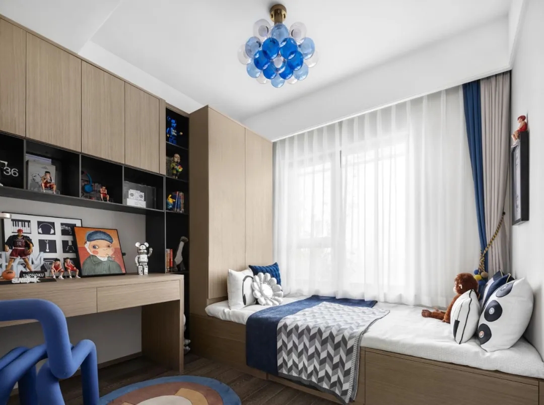 兒童房以明亮的藍色與暖橙相互碰撞,空間中融入收藏手辦的興趣愛好,放置玩具收納柜,為小主人留有足夠的玩耍收納空間。柜內各式玩具與書籍,前方櫻木花道公仔迎光而立,好似一個奮發向上的少年,身后承載著的是夢想,而夢想在閃閃發光。
