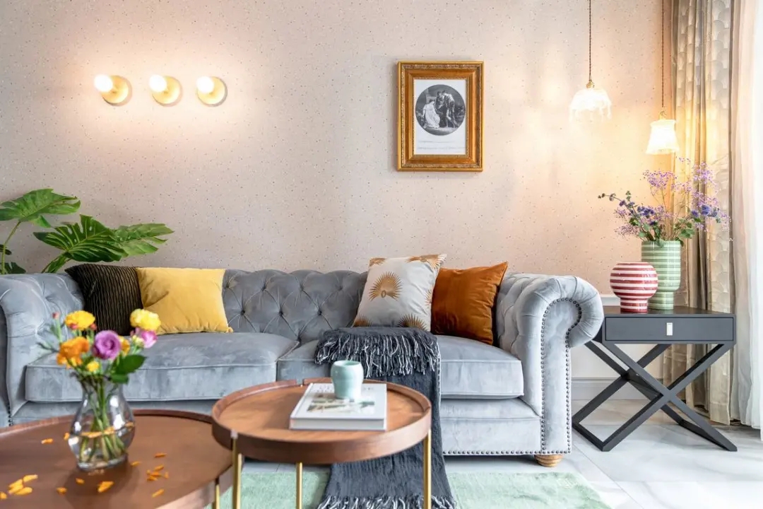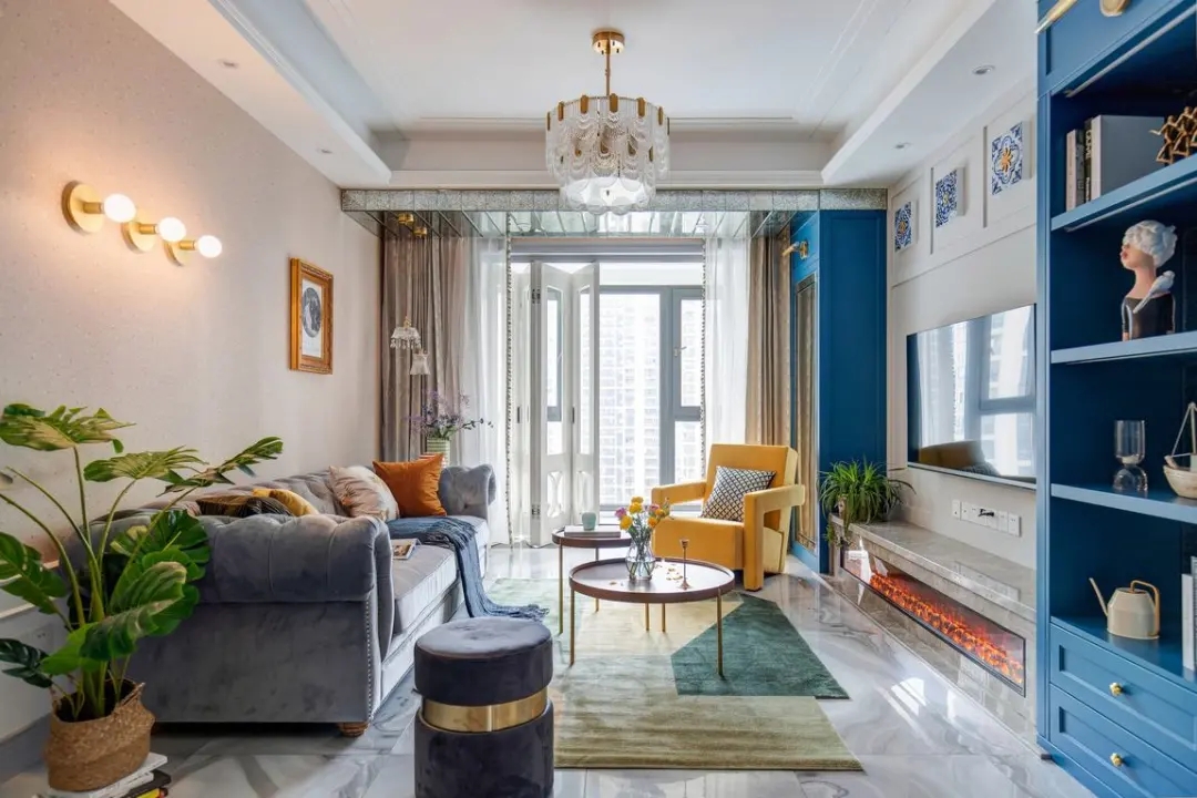 一眼看去,客廳有著諸多的設計元素,沙發墻是暗粉色的、沙發是歐式造型的灰色皮藝材質,而茶幾則是極簡的托盤設計,電視墻加入地中海風格的藍色,結合細節優雅、大膽配色的軟裝,也讓客廳充滿優雅時尚的高級設計氛圍。