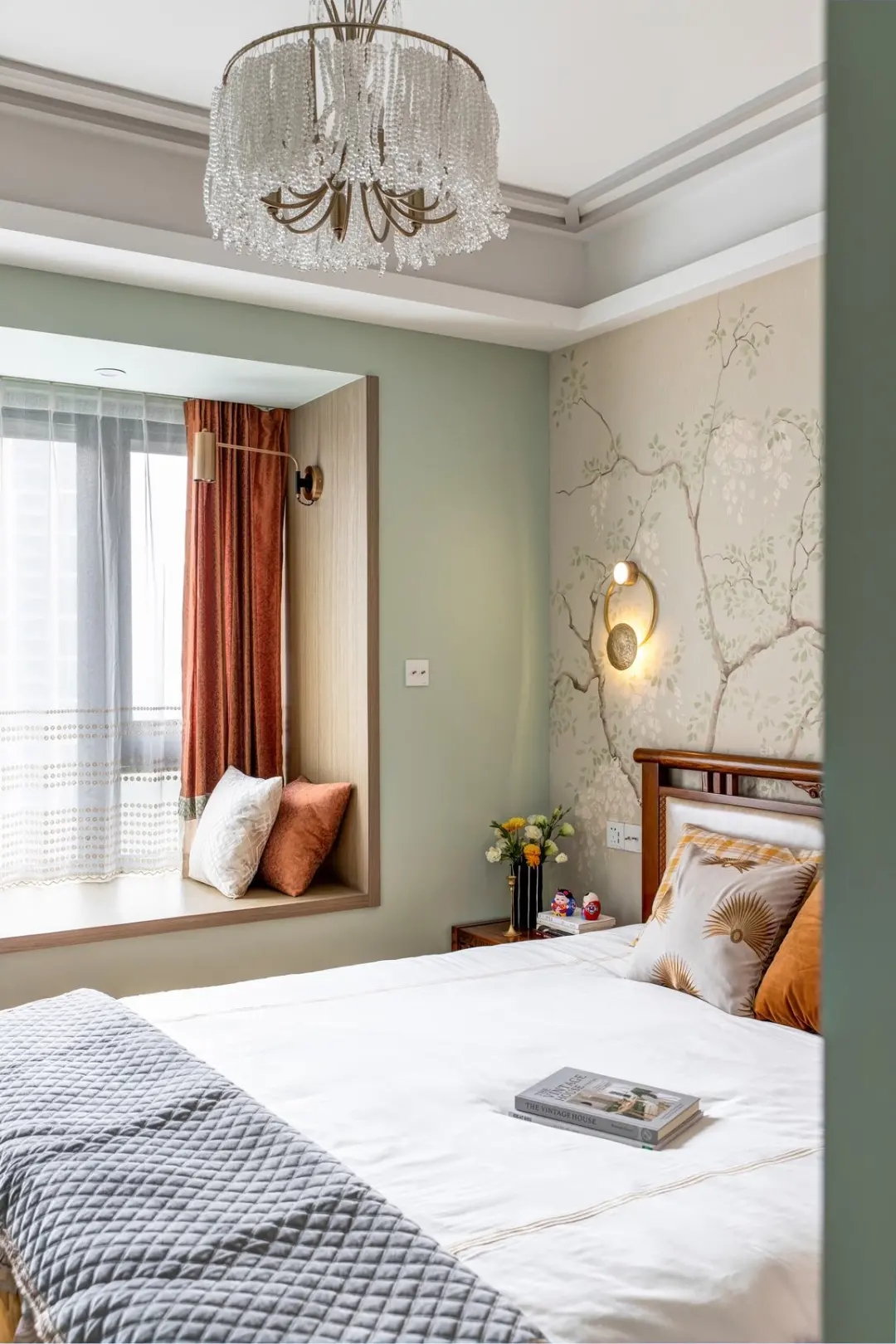 主臥空間的風格也比較獨特,床頭墻貼著意境的墻布,布置一張實木床,結合衣柜柜門的木質感,讓空間有一種中式的意韻。而床尾則是綠色的簡潔墻面為主,搭配白色帶浮雕的房門與踢腳線,也呈現出一種別樣的簡約歐式感。