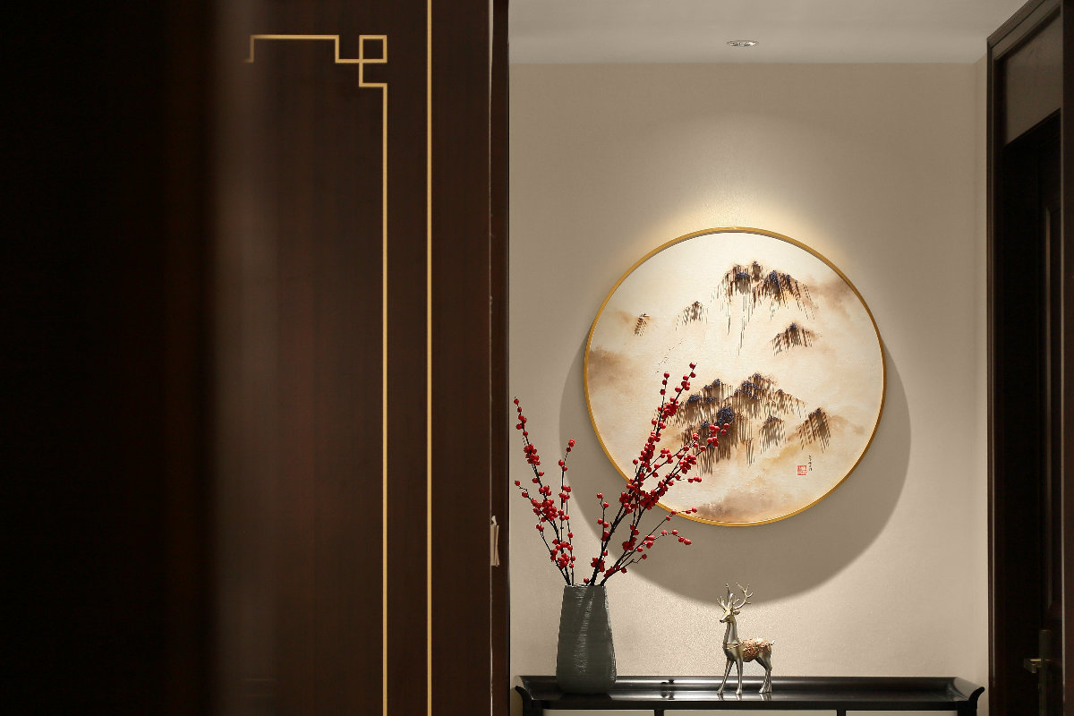 玄關端景柜上方的銅圓釘子畫,立體感強,變化中又有統一,成為進出吸睛的亮點。在交織的過道空間,用射燈的光來強化掛畫的質感,翰墨禪意輕輕點染,于細節之處泛起漣漪,呈現整體澹泊清靜、拙頓歸樸之意境。