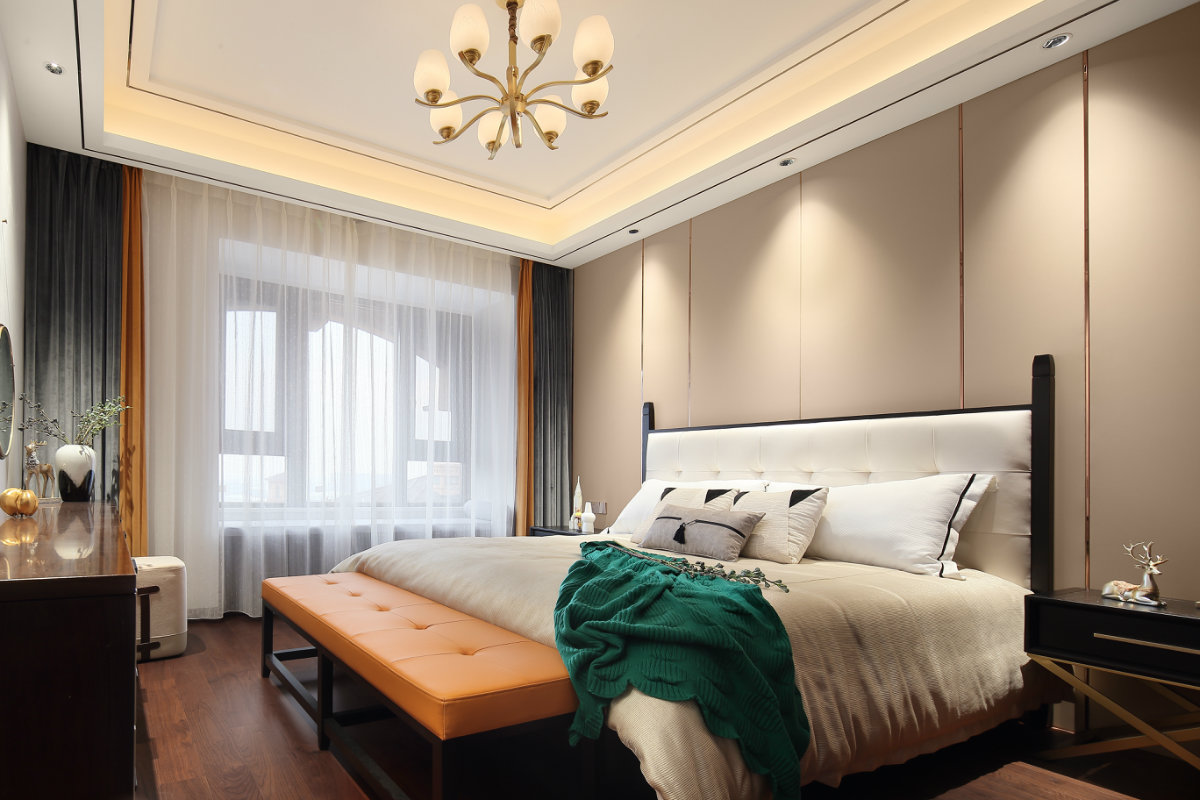 主臥,暖咖色、米白、灰色碰撞橙色的跳躍,沉淀心靈卻不失情調。“鳳髻金泥帶,龍紋玉掌梳。走來窗下笑相扶。愛道畫眉深淺、入時無。”北宋詩人·歐陽修《南歌子·鳳髻金泥帶》中描繪的丈夫為妻子畫眉的情景,仿佛就在眼前浮現。整體暖色燈光營造出一個溫柔的環境,米白色皮床配合咖色硬包以及豎向金屬線條,大氣又溫馨。