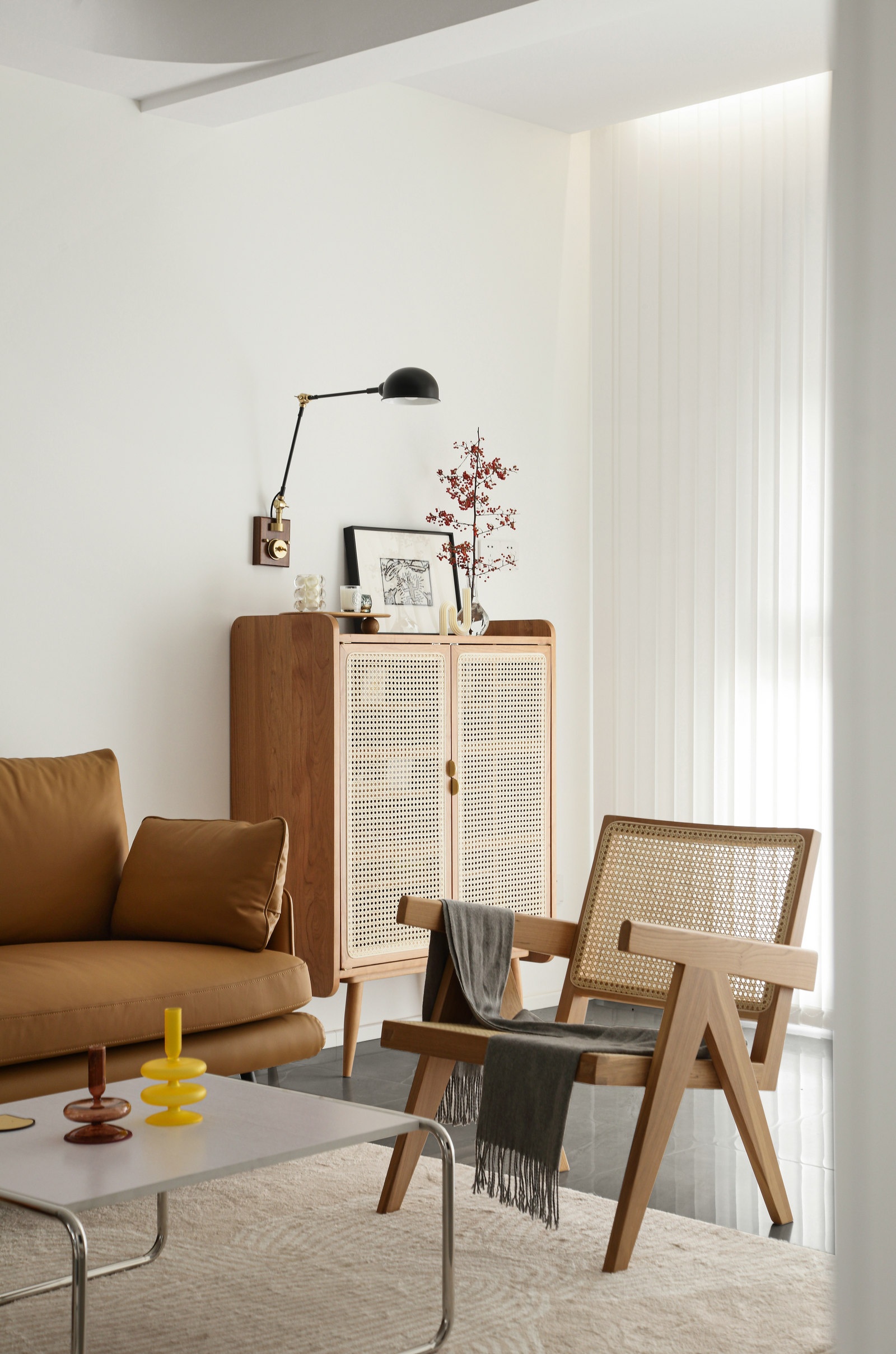 女主小姐姐喜歡溫和的顏色,我們在設計交流的時候,把色調定為木色白色為主,暖橙點綴,灰色打底,整體空間給人靜謐溫馨的感覺。燈光設計采用無主燈,用點光源壁燈等組合滿足客廳采光需要,頂部的弧形增強設計感,也令空間更柔和。沙發(fā)背景干凈簡約,木橙散發(fā)緩緩暖意。