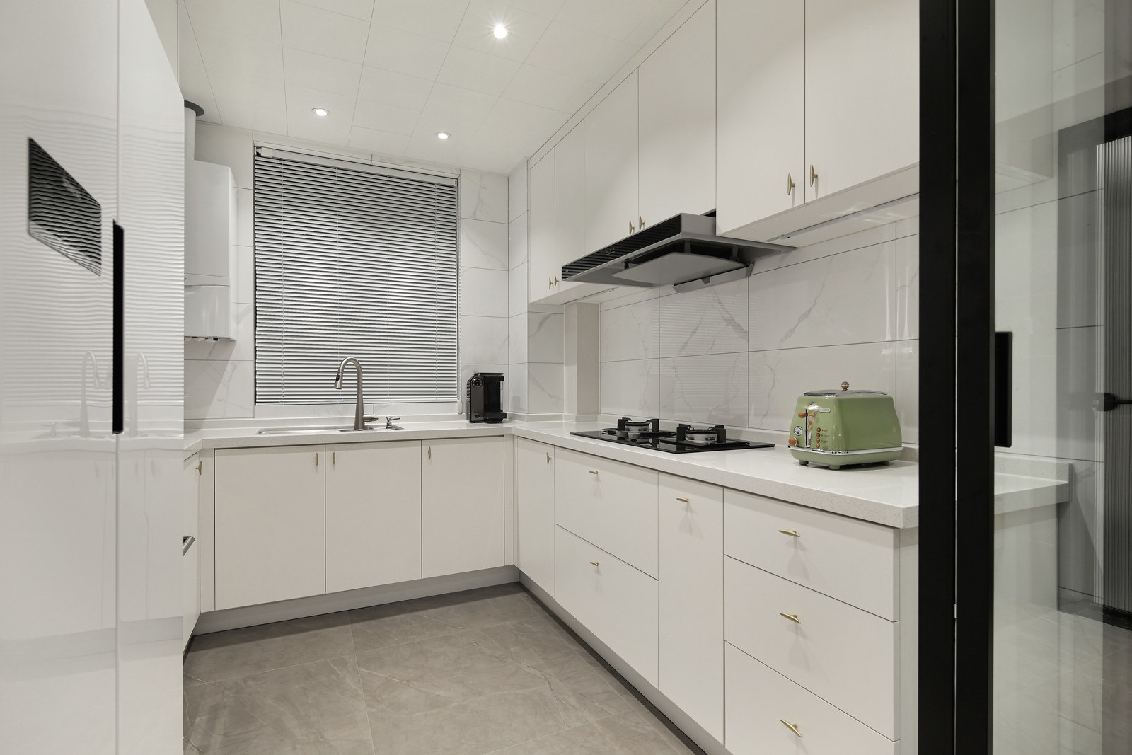 廚房U型櫥柜,乳白色干凈明亮,搭配精致的柜門小把手,細節(jié)見品質。