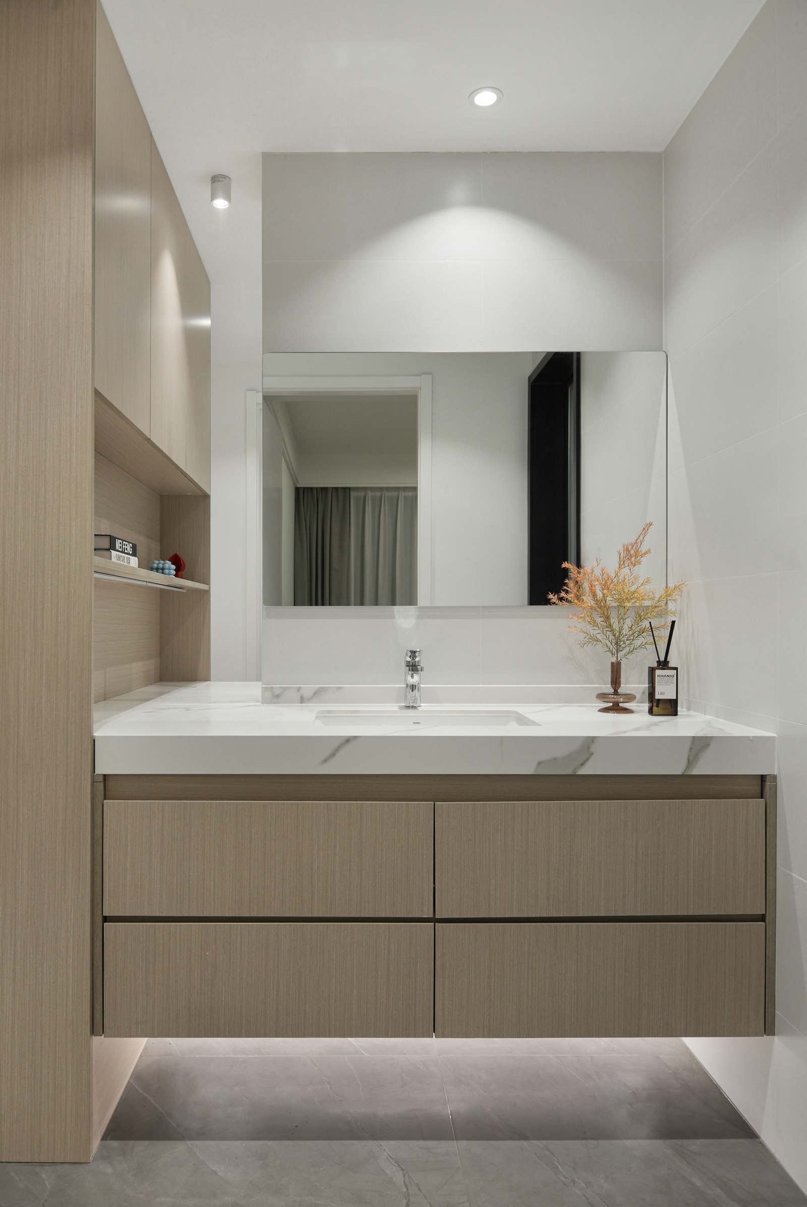 干區(qū)延續(xù)懸掛柜設計,方方面面考慮到實用和美觀。大理石臺面和木飾面形成材質對比,一剛一柔間提升氣質。