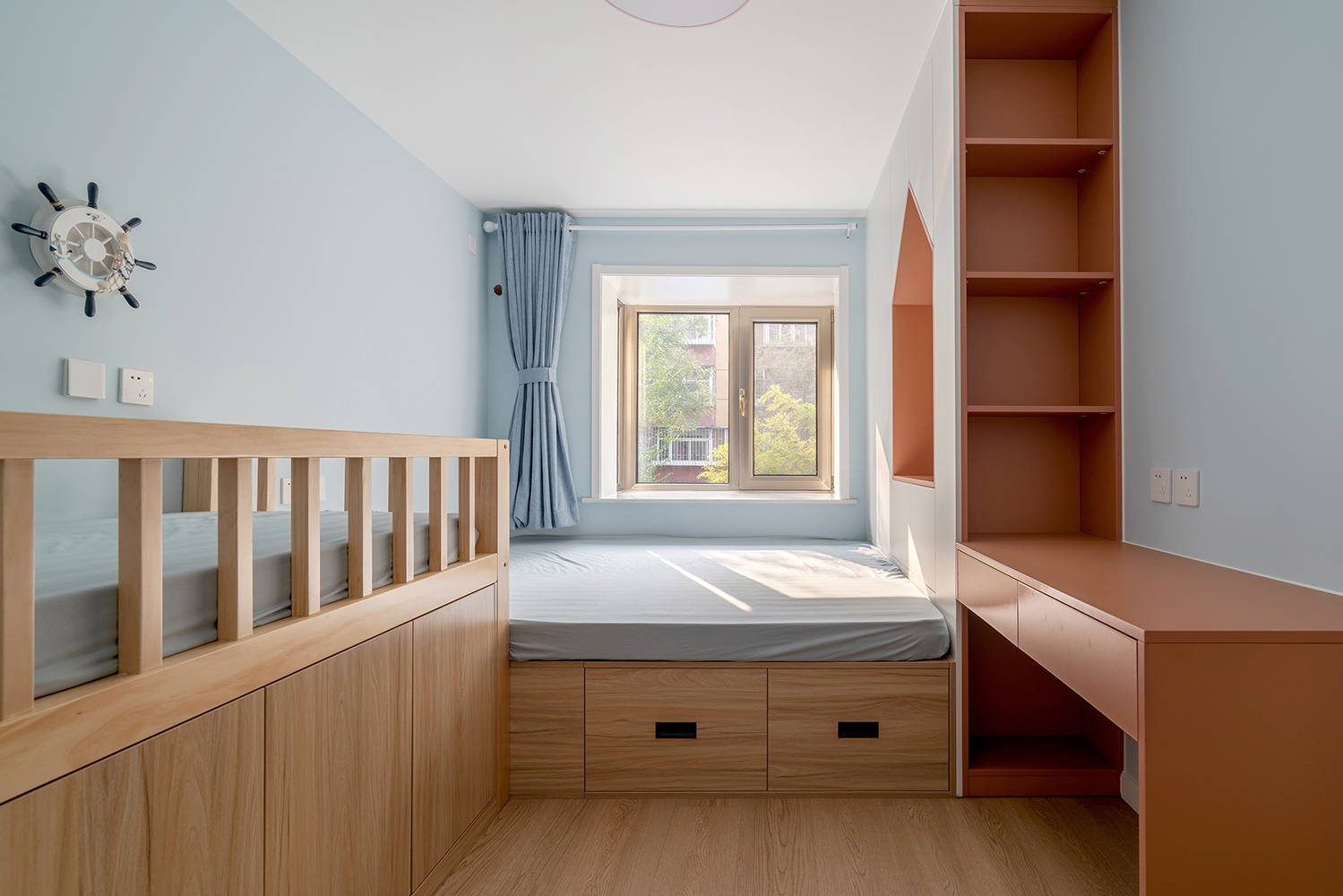 朝南的兒童房,定制了超大的榻榻米睡眠區,旁邊加了獨立的單人床,輕松的容納下一家四口的睡眠空間。墻面的輪舵造型壁燈充滿了童趣,窗簾選擇了跟墻面一個色系的藍色。兒童房書桌還有敞開格做了橙色,飽和度相對高一些,跟墻面做一個強烈的對比,激活空間。因為是兒童房,兩個孩子都還小,舍棄一部分儲物空間,做了小房子造型的龕,盡量的增加一些童趣的元素進去。