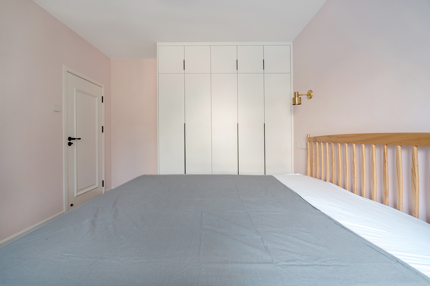 次臥是父母的房間,做了通高的大衣柜來保證充分的儲物空間。應屋主要求,墻面刷了女主喜歡的淺粉色。黃銅材質的壁燈質感還是很強的,床和梳妝臺都是購買成品。