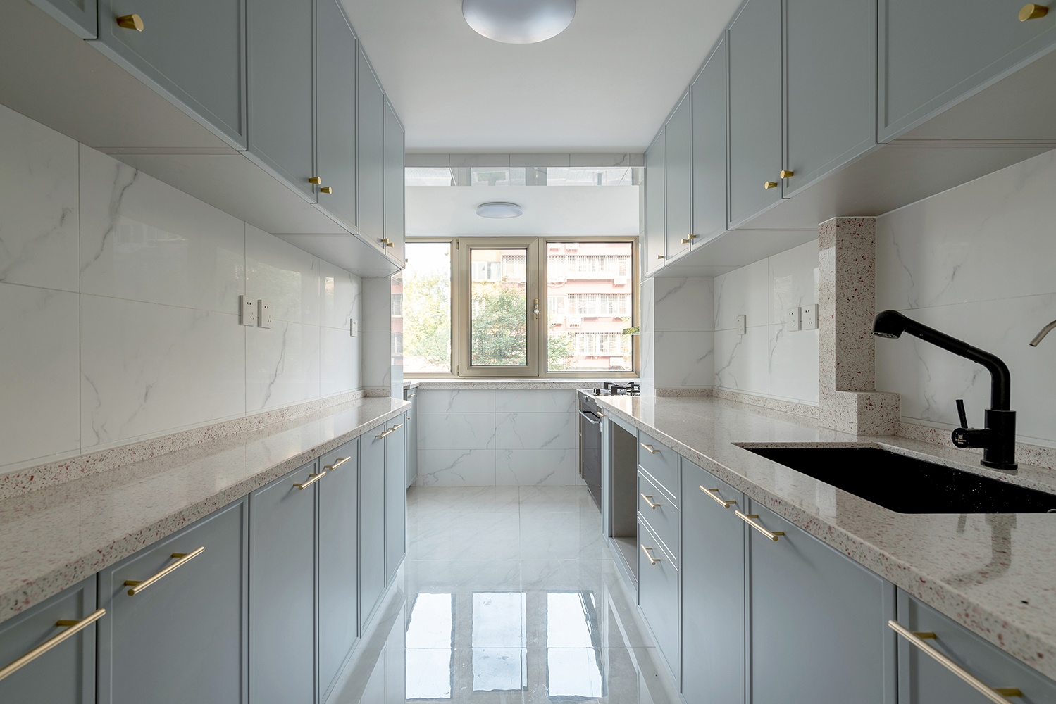 玄關灰藍色的掛衣空間搭配黃銅拉手更顯精致,冰箱外置,內嵌一側。