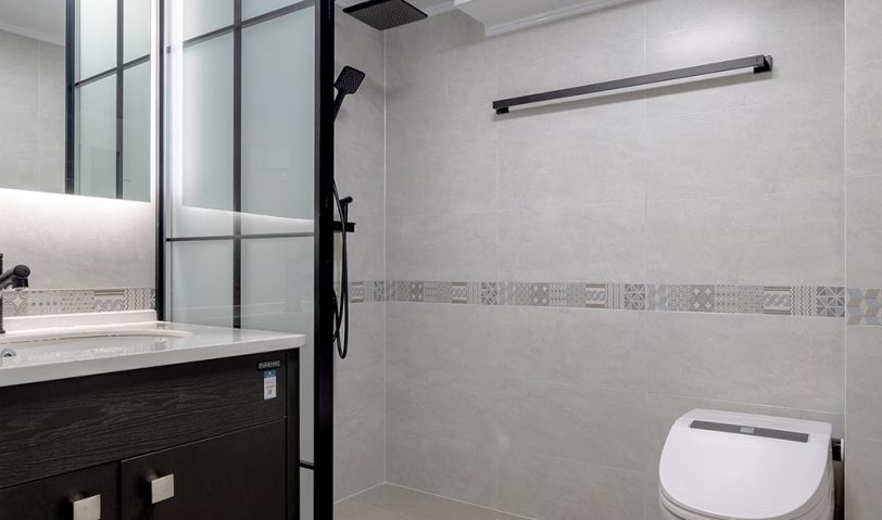 淋浴區預留了足夠的空間,供媽媽給兩個孩子洗澡的操作空間。花灑玻璃隔斷和毛巾架都統一用色。