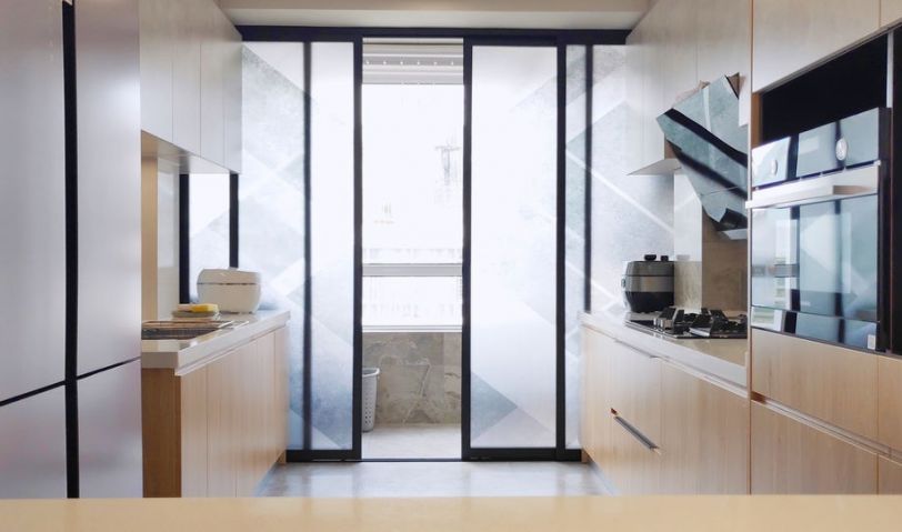 廚房是雙一字布局,開敞的空間就算有兩個人同時操作也不會擁擠。設計師用了鋁鎂合金推拉門分開洗衣區和廚房,靈活透光。灶臺附近臺面都在吊柜下方單獨配置操作照明。墻面是新中源的瓷磚,這個紋理做完業主很喜歡。水槽上方也單獨配置了操作照明,水龍頭使用的是米家感應式龍頭。不用擔心手上的油漬吧龍頭弄臟啦。