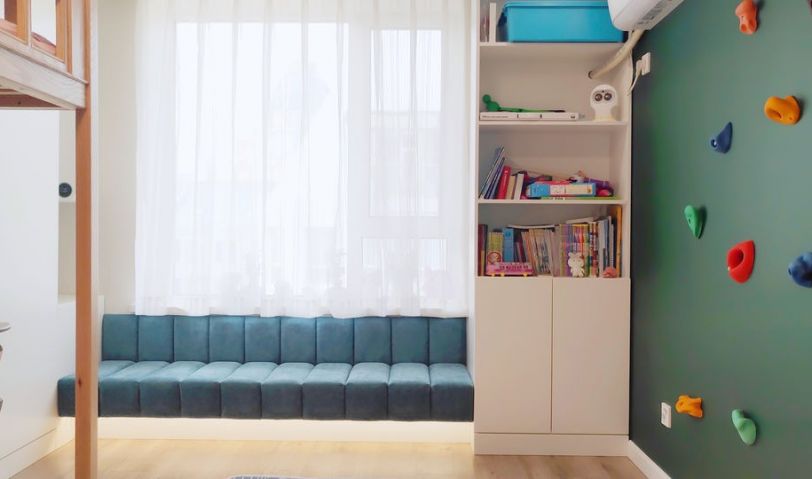 兒童房進門右側是整面的攀爬墻,墻面上做了舒納沃恩磁力漆和黑板漆??梢栽谶@里畫畫,磁鐵石可以展示作品。窗下是定制的軟包卡座,小主人也有自己的會客區,招待小朋友一起玩耍。兒童床是定制的樹屋高架床。桌椅是主人原先的,直接搬了進來。進門以及床的墻面上單獨定制的整幅兒童壁布。