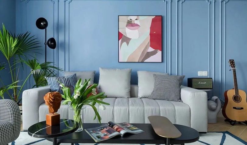 客廳整體現代舒適的空間,陽臺與客廳打通做成抬高的地臺,裝上紗簾讓自然采光進入客廳,而客廳整體在藍色的墻面基礎,布置深色電視柜與茶幾,在綠植與優雅家具的搭配下,也讓空間顯得格外的安靜高檔而優雅。沙發墻在藍色的背景墻基礎,加入邊框造型,并掛一幅紅色的裝飾畫,增添了空間的時尚氣質。灰色布藝沙發+黑色橢圓茶幾組合,沙發邊上的盆栽與吉他,也使得空間更加有精致感。