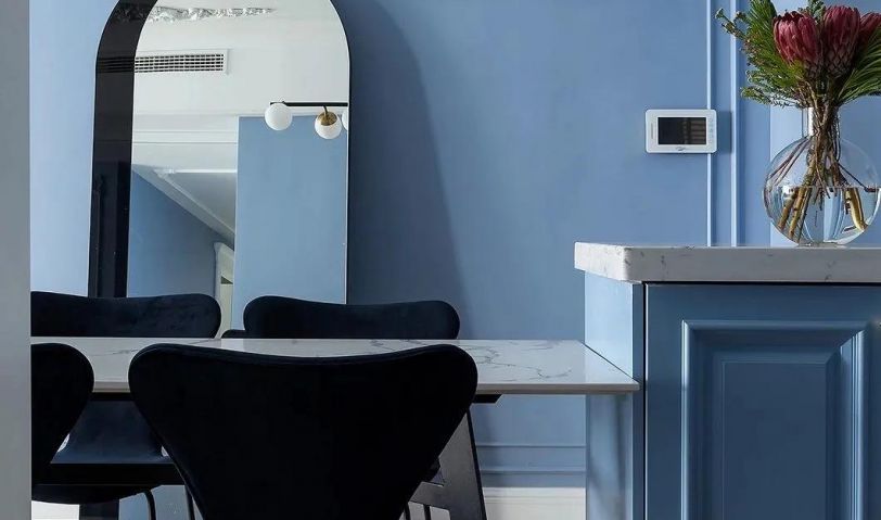 餐廳保持藍色調的空間,在靠近門口的過道靠放一面拱形造型的全身鏡,為主人出門提供了一個整理儀容的體驗;餐桌則是挨著中島臺布置,以石材臺面的設計,搭配上深色的餐椅,臺面上還有花瓶的布置裝飾,也讓空間顯得更加優雅浪漫而情趣。