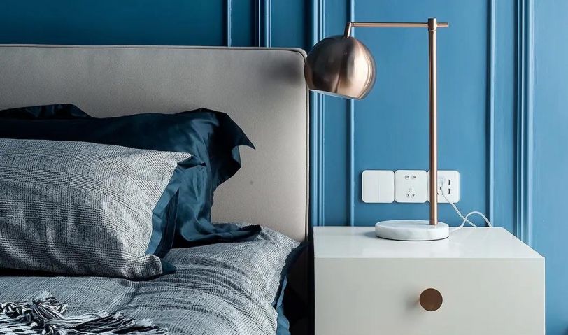 主臥也是以藍色的墻面空間,床頭墻還加入了邊框造型,布置灰色布藝床、灰藍色搭配的床單,旁邊一個金屬腳架的床頭柜,擺上金屬材質的床頭臺燈,也讓空間顯得安靜而華麗高級。床尾位置擺一張黑色斗柜,布置花瓶、裝飾畫與小飾品,在藍色安靜的氛圍下,加入端莊的軟裝搭配,也提升了空間文藝寧靜氣息。