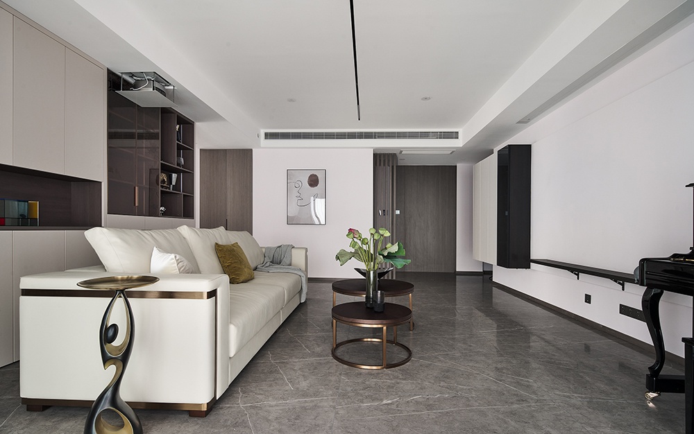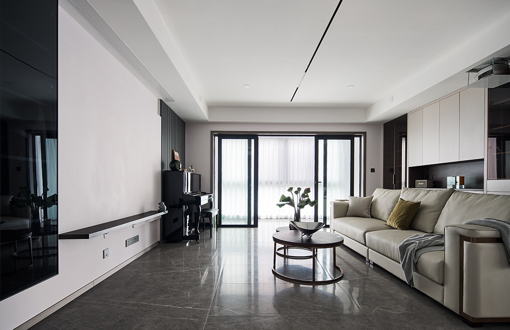 室內空間以白色為基調,設計師用簡明利落的線條為一家人勾勒一幅美好的生活畫卷。皮質的三人沙發,背后的區域是強大的收納柜兼展示區,大理石瓷磚通鋪,紋理自然。