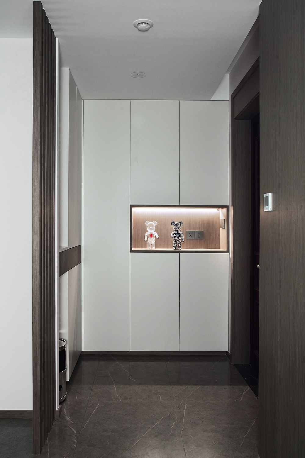 玄關入戶處以純凈的白為主,入眼是一片明凈純粹。懸空設計的柜體豐富空間層次,敞開的柜子頂部暗藏燈帶,讓人感受歸家的儀式感。