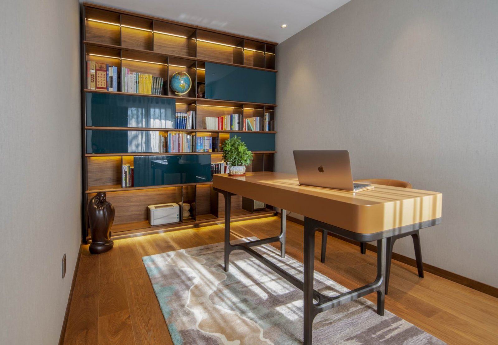造型簡潔大方,綠色硬包布、手工植物圖案地毯以及家具配色都在統一迎合自然這一主題。