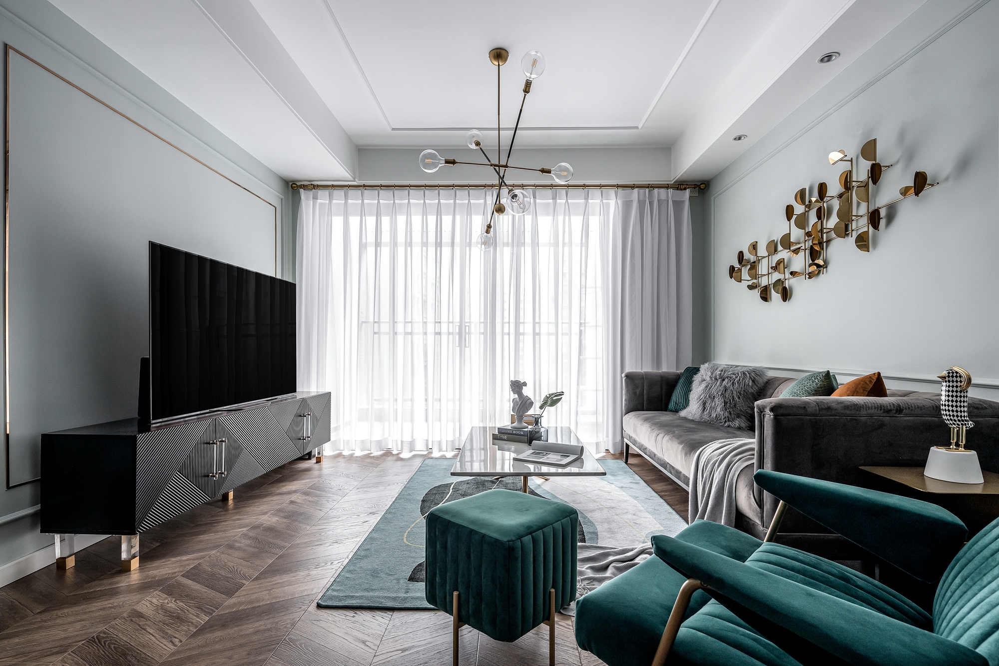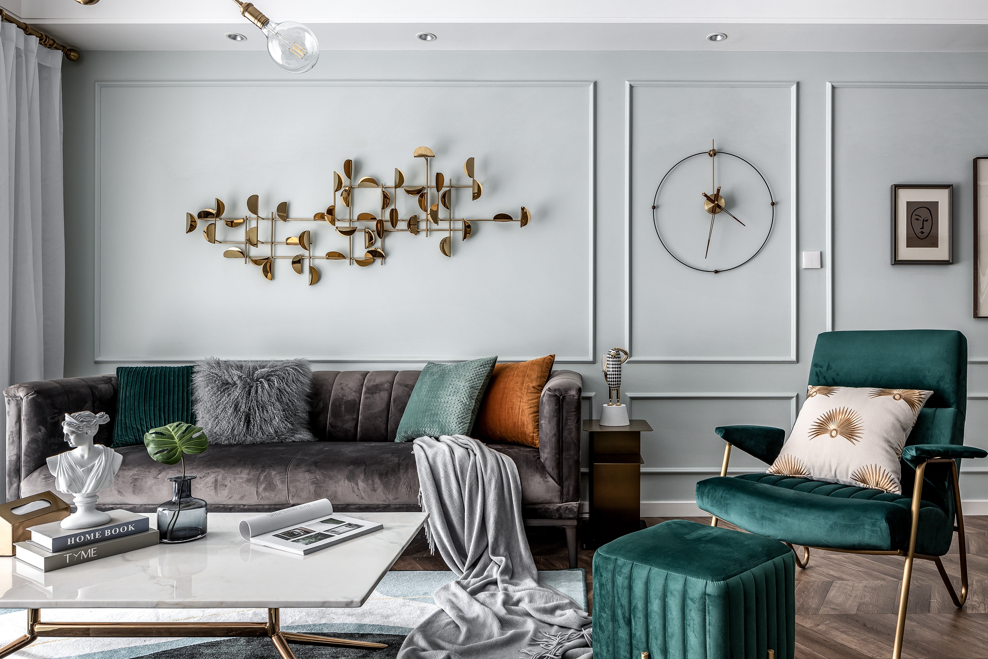 交錯(cuò)的設(shè)計(jì)感主燈的使用豐富了客廳的層次感,半透明窗紗讓陽光能夠更好的穿透到室內(nèi),使空間明亮通透。少量而精致的金屬元素很好的呼應(yīng)了整個(gè)空間的輕奢質(zhì)感,墻面去奢從簡,運(yùn)用大量纖細(xì)的石膏線條來進(jìn)行空間的區(qū)域劃分。灰色空間往往會(huì)讓屋主覺得家里過于冷淡,所以在軟裝階段以溫暖的絲絨材質(zhì)作為主體搭配,中和空間的顏色,讓別致的設(shè)計(jì)感更具舒適性。復(fù)古魚骨拼搭配墨綠絲絨質(zhì)感單人椅無疑是提升室內(nèi)格調(diào)的表達(dá)方式之一。