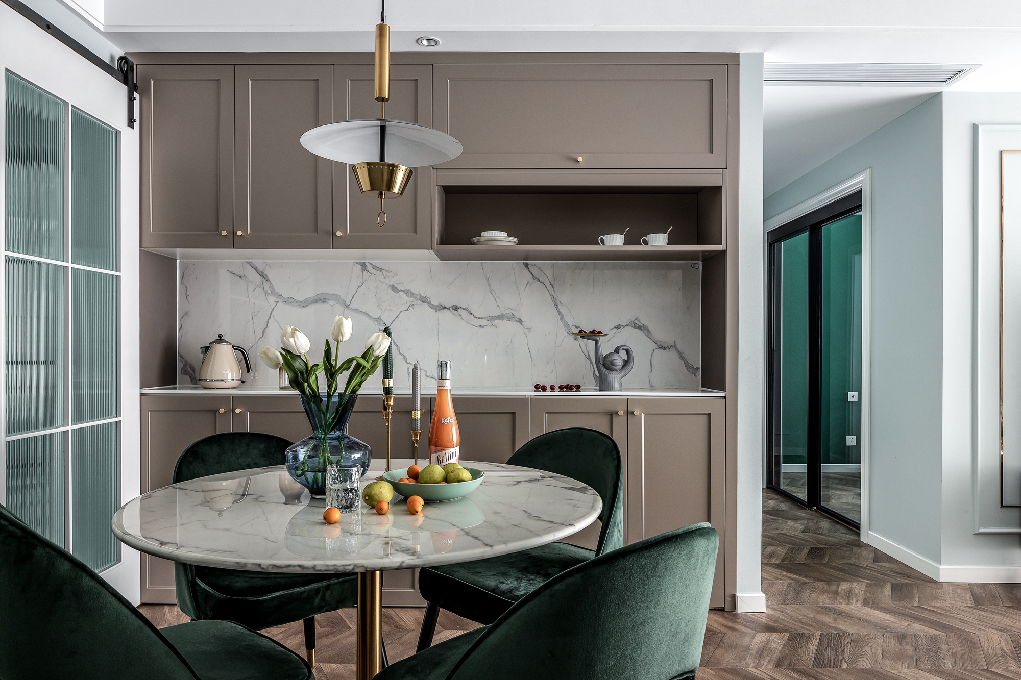 墨綠絲絨餐椅搭配簡約金屬吊燈在與客廳氛圍相融合,也以輕奢感塑造了每天的用餐儀式感。開放式西廚設(shè)計(jì)讓增強(qiáng)了三人平時(shí)零碎用餐互動(dòng)時(shí)光,賦予了共同的生活樂趣。