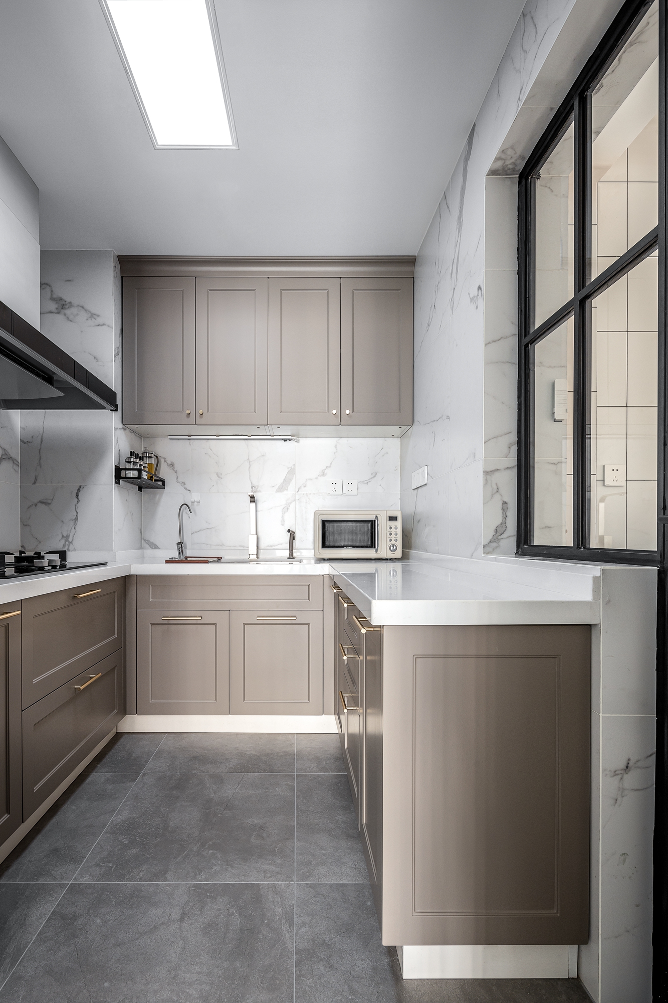 中廚與開放式西廚風(fēng)格相互融合呼應(yīng),灰咖色搭配大理石貼磚,低保和色彩感讓人舒適與放松。
