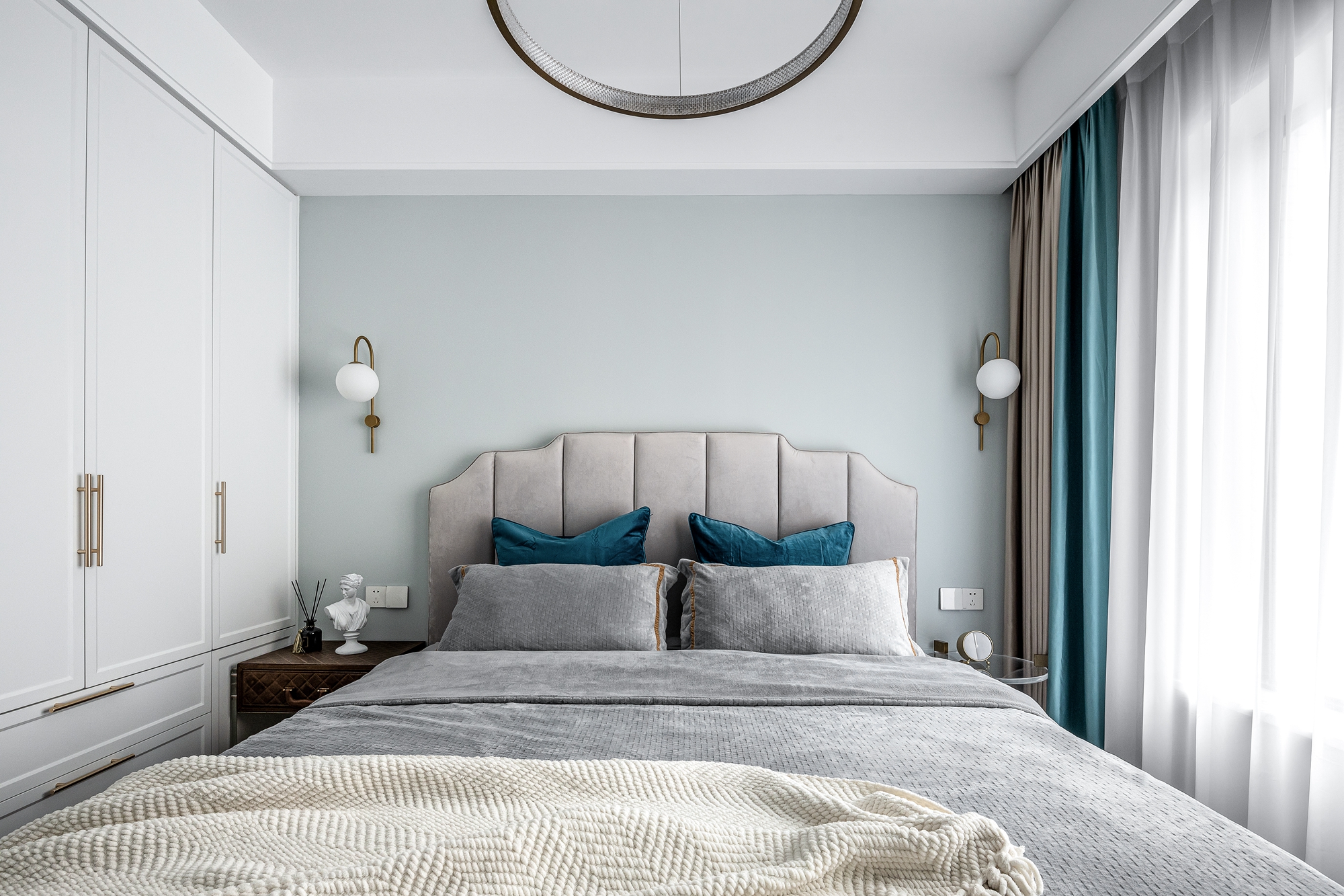延續(xù)客廳的絲絨與金屬搭配風(fēng)格又進(jìn)一步做了減法,在保持輕奢質(zhì)感的前提下讓人感覺更加舒適和沁人心脾。極簡的室內(nèi)裝飾稍加點(diǎn)綴,整個(gè)愜意的空間被屋主喜愛的自然香氛所包圍,高效舒適的睡眠隨之而來。