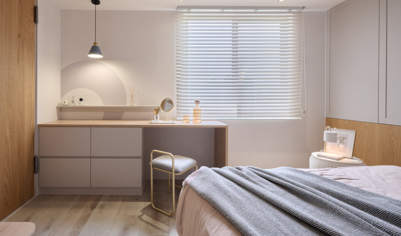 臥室的設計延續(xù)公共區(qū)域的設計語言,奶油色營造放松、溫馨的氛圍,搭配原木質感的護墻板,低調又不失柔美,再配以原木的化妝桌,溫馨優(yōu)雅,把生活的品質展現的恰到好處。