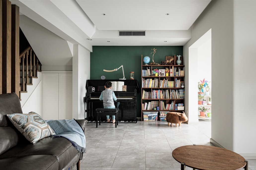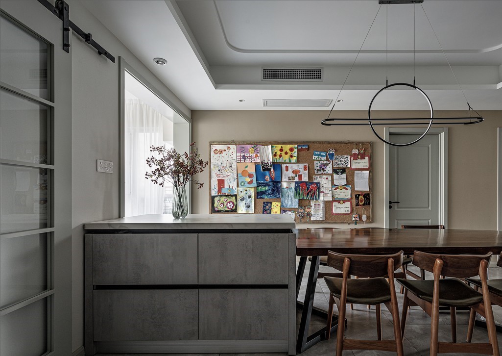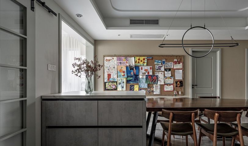 餐區是平日家人距離最近的地方,大家一起聊聊學習、工作、和開心的趣事。樂享其中。用軟木做的背景,孩子創作的作品成為主角。