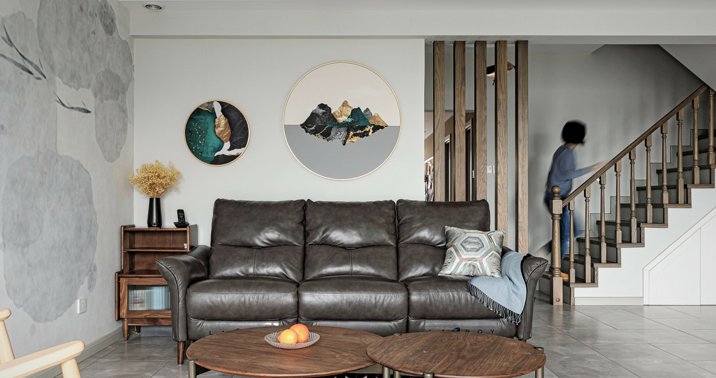 客廳打破常規,前后背景墻的模式,去背景化處理手法,木格柵實木條作為隔斷,延長沙發區域的背靠空間長度,沒有用墻面形式來加長。保留最大視覺空間感
