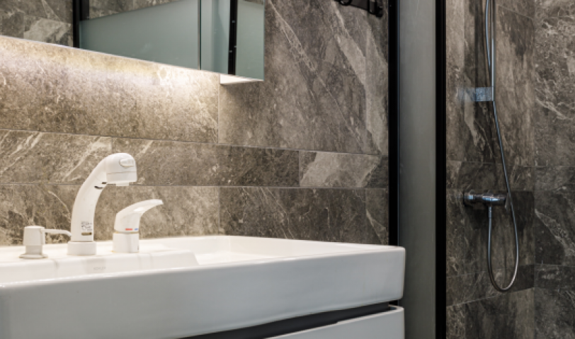分離式設計需要的是空間。能滿足的盡量是滿足,使用起來確實方便,對于一層客衛,整體搭配上以深色磚來凸顯氛圍品質感,瓷磚的大小構成比例的變化,讓單一色調的瓷磚更加有層次感。