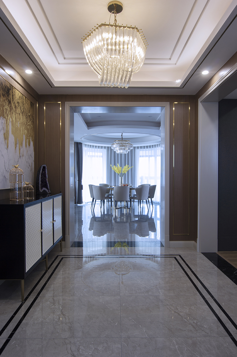 玄關處因為是各個空間流線的中轉站,所以玄關柜設置在了一側。頂面吊頂造型和地面黑色走邊呼應,中間配了一個適中的水晶燈。
