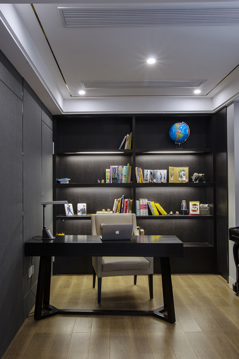 書房是一個多功能區,不僅容納了書寫的功能,還在旁邊放置了鋼琴。書柜的空間是一個L形的,為了追求形式上的對稱性,讓L形的尾端做了黑色的柜門處理。燈帶隱藏在層板之中,讓這個書架不再灰暗。書架左側也是一個隱形門,面上做了硬包處理。這個是設計階段業主特意強調的需要預留的安全逃生門。