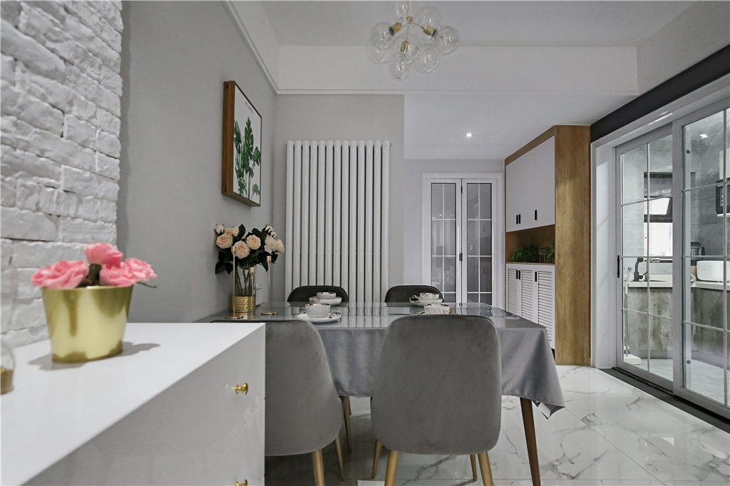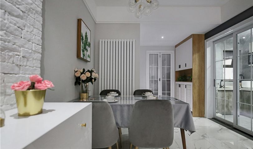 由于餐廳空間略顯狹小,暖氣片便成了墻面獨特的裝飾,金屬、絲絨等帶著輕奢符號的元素妝點餐廳,營造一種低調卻又有品質的生活氣息。