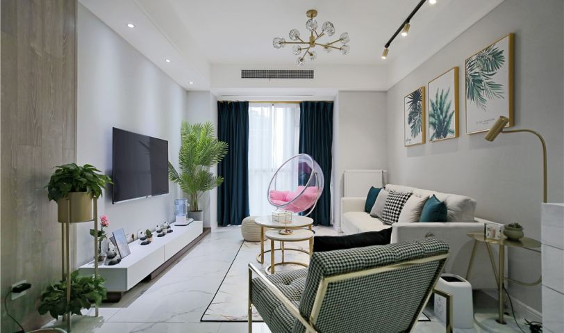 整體客廳空間以白色為主導色,配合胡桃木色墻板和地板,局部墻面點綴黑色,中和整個空間,為了使得空間相對活潑,軟裝的選擇上跳躍了一些,讓整體材質與顏色相互呼應。
