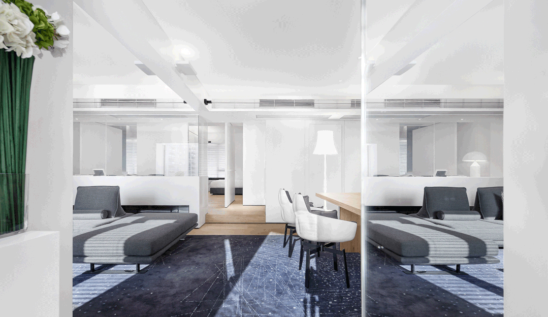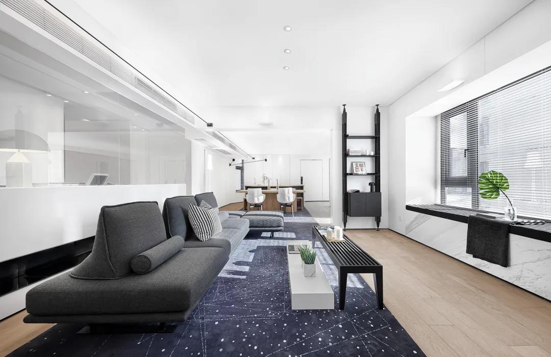 沙發下鋪就一塊帶有銀河光輝的地毯,從客廳延伸到餐廳。坐在沙發上如同踏步在璀璨的星河中,充分滿足了小孩子的好奇心和探索欲。